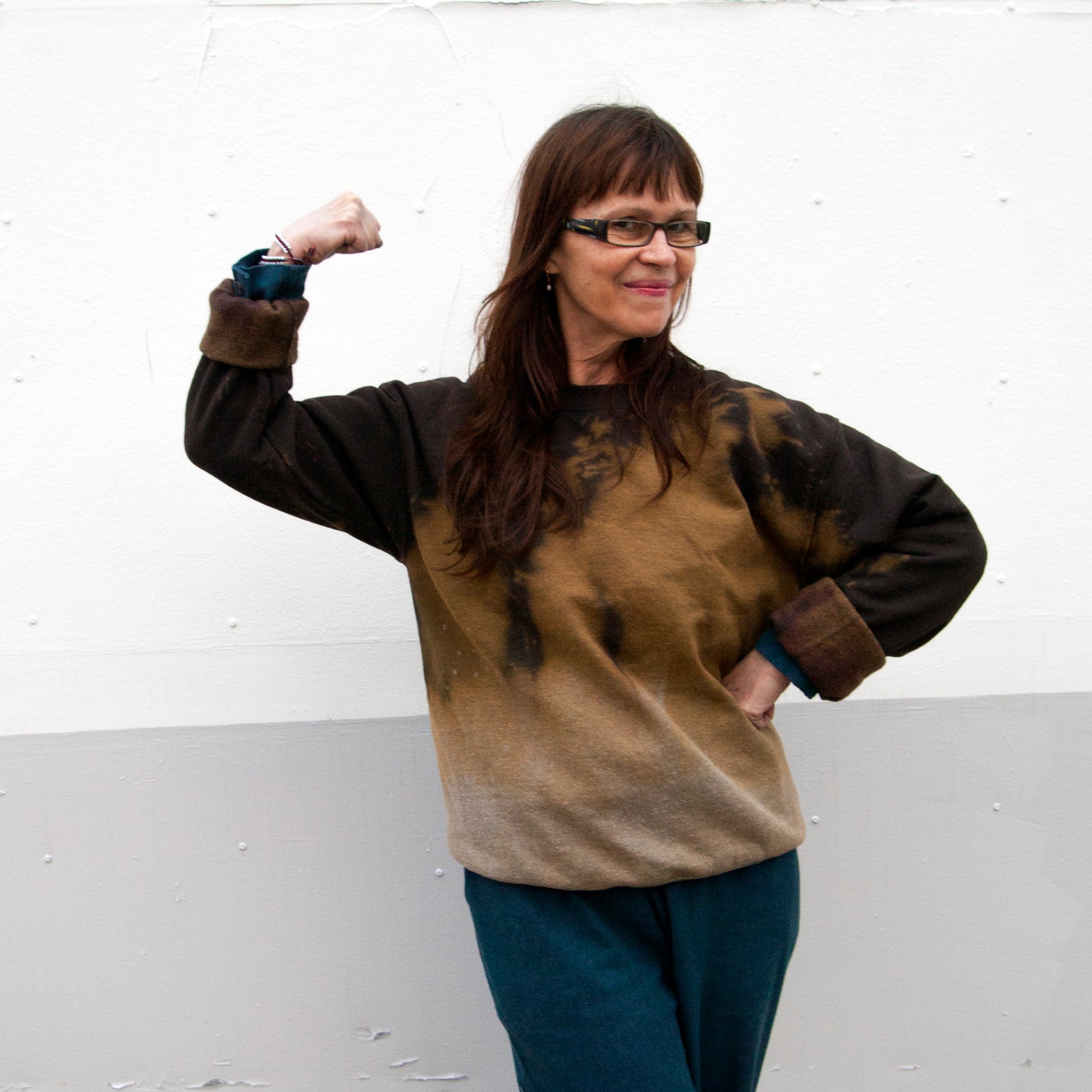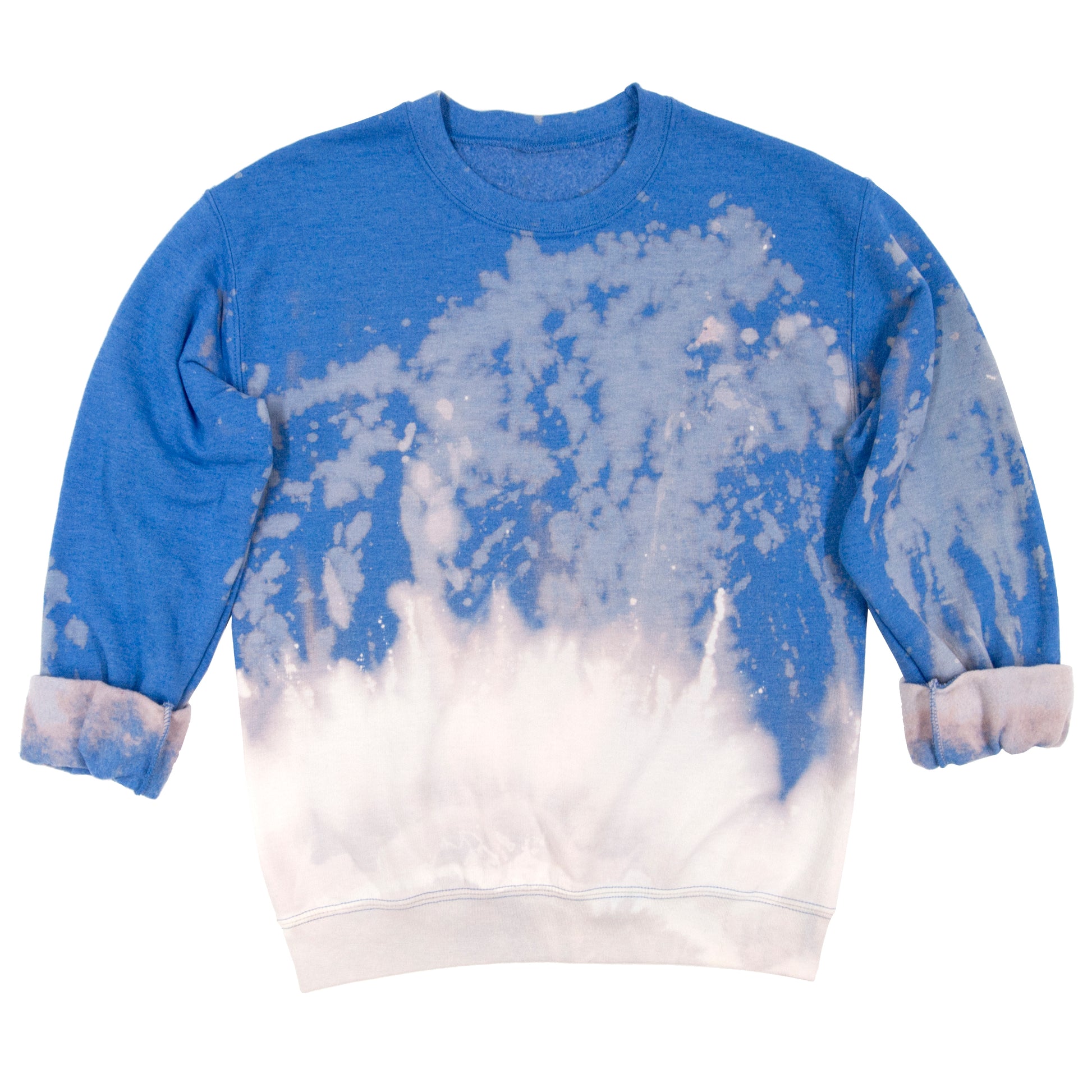 Each piece is individually dyed, so completely unique. A "discharge" dip dye technique using color remover, neutralizing agent, and several wash cycles, creates a different pattern on each sweatshirt.