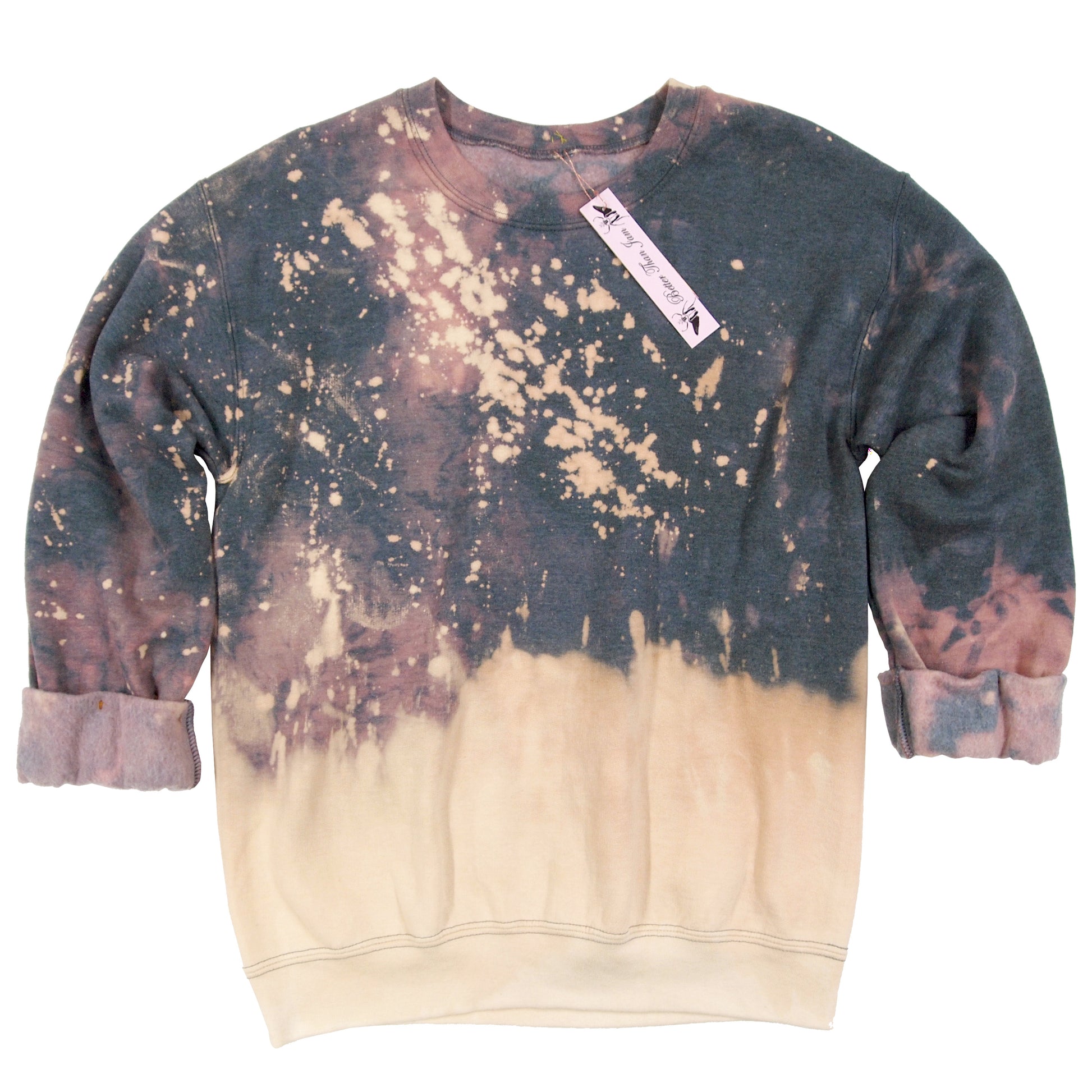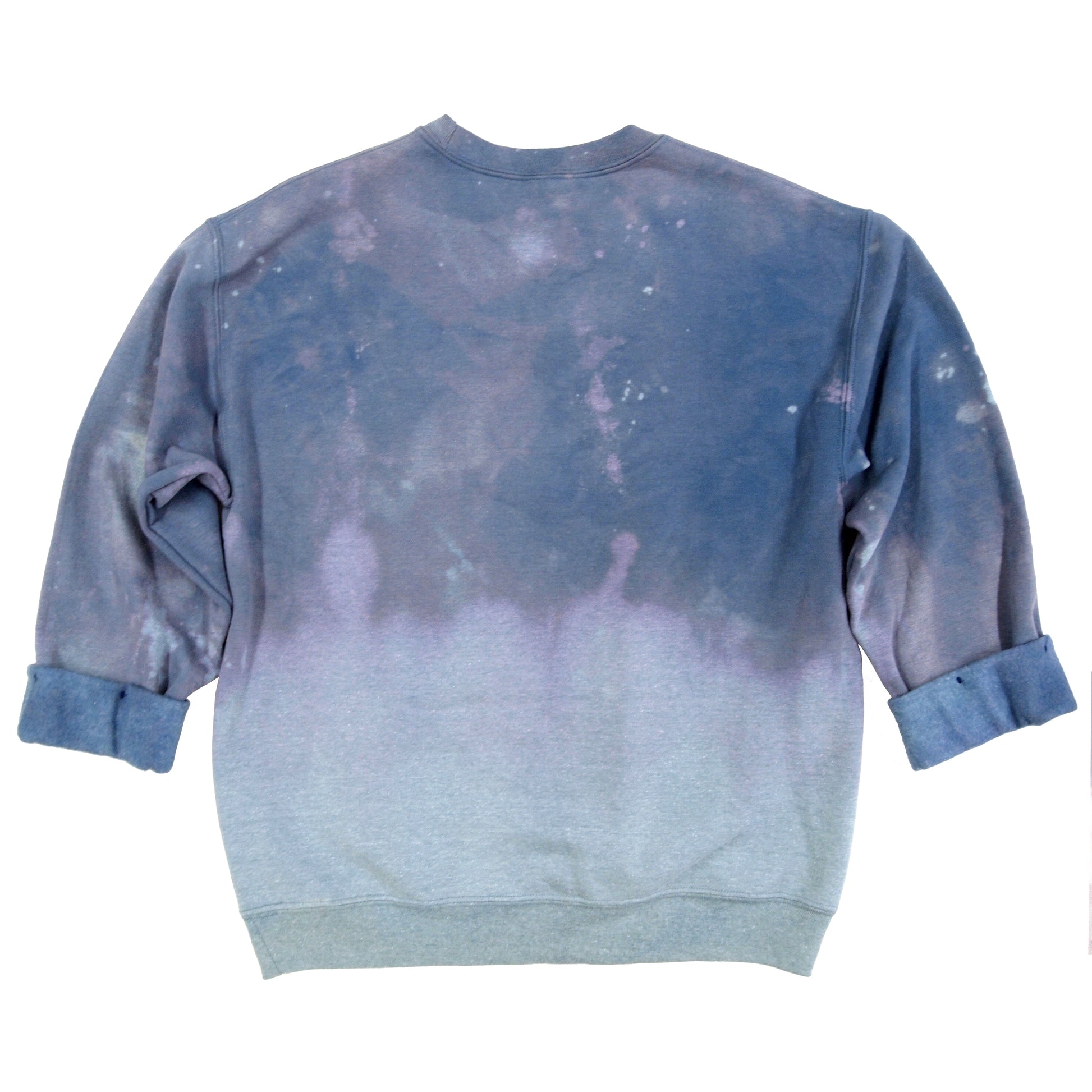 Each piece is individually dyed, so completely unique. A "discharge" dip dye technique using color remover, neutralizing agent, and several wash cycles, creates a different pattern on each sweatshirt.