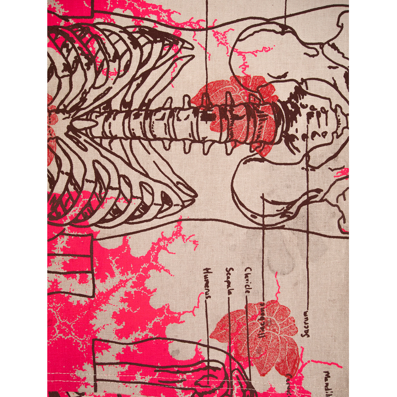 Hot pink "Mandelbrot" fractals, brown labeled skeleton, and red blockprinted coneflowers on pomegranate skin and iron dyed linen.