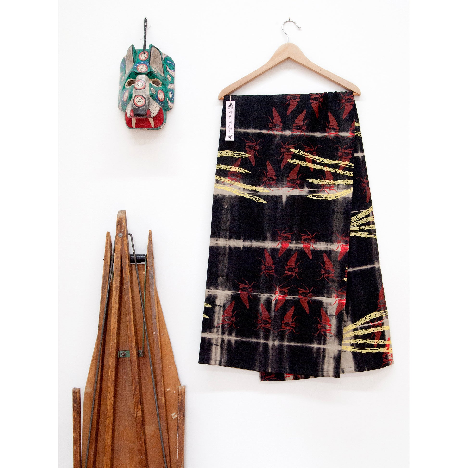Black Linen Anti Shibori Dyed Printed with Goliath Beetles and Feather Rings