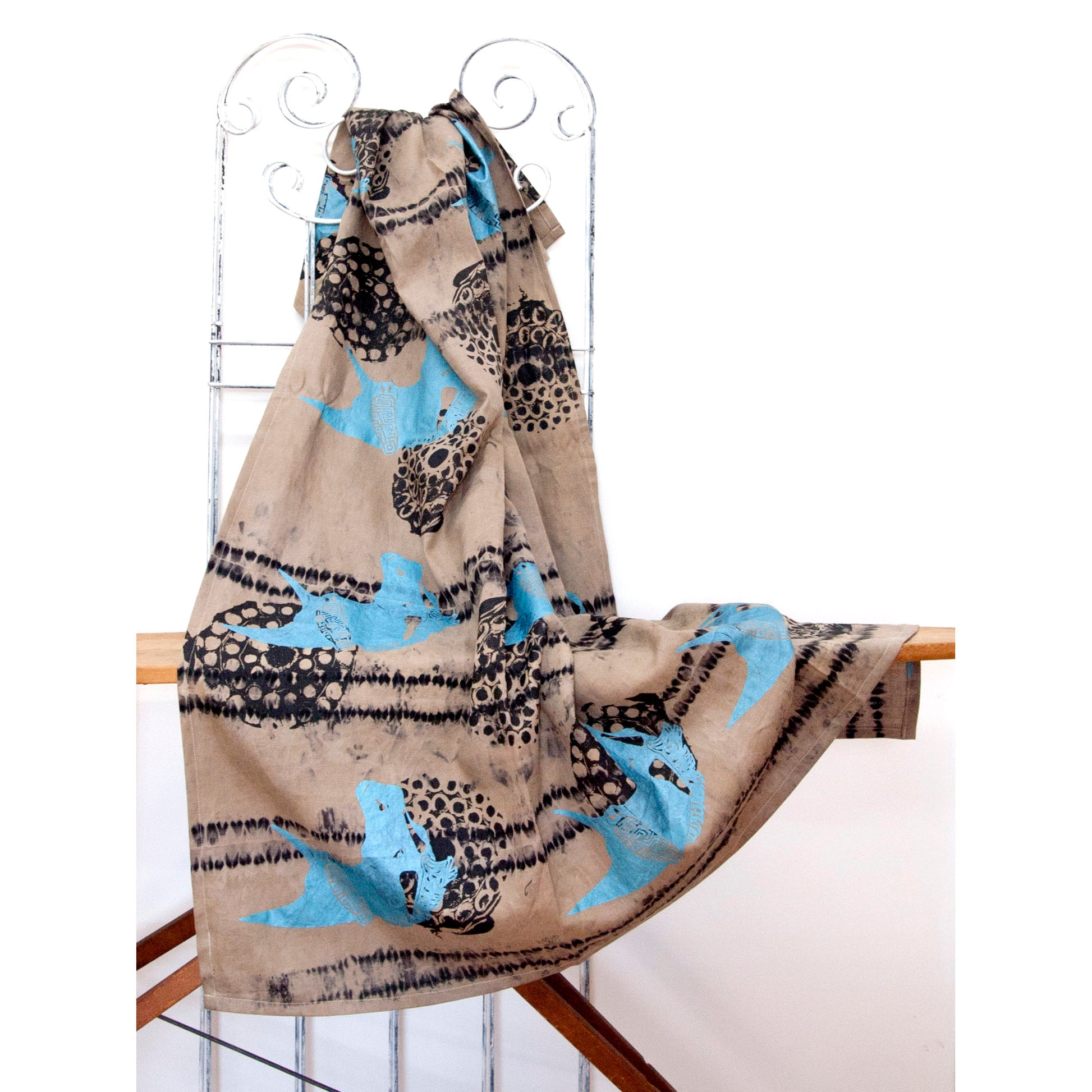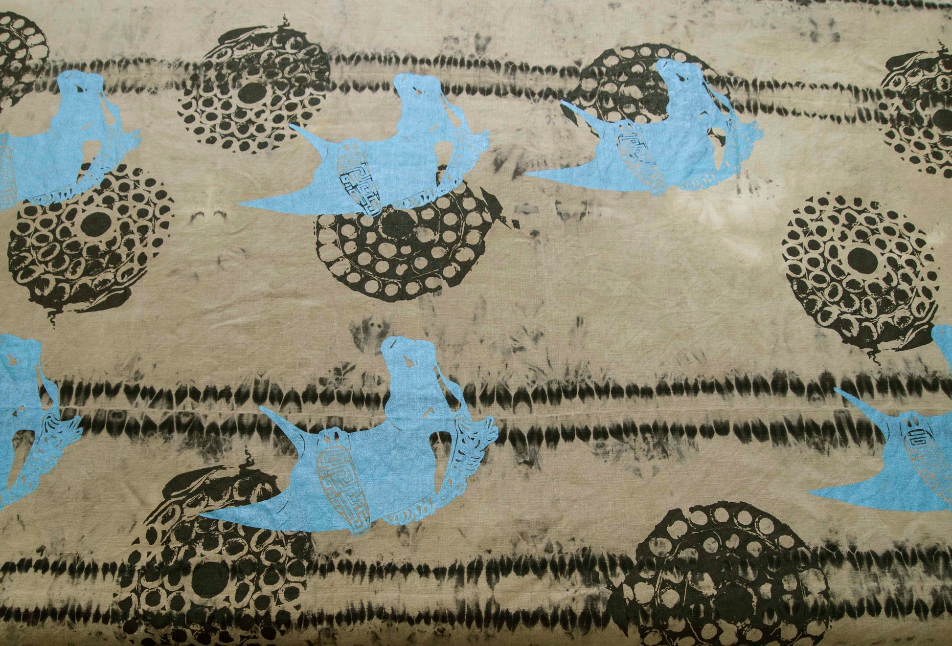 Then I hand silkscreened 2/3 times, layering the different images; of pearl light blue Greek horse heads and black firework remnants. Images/patterns are original designs of mine, that are hand drawn, original photographs, or digitally manipulated objects.