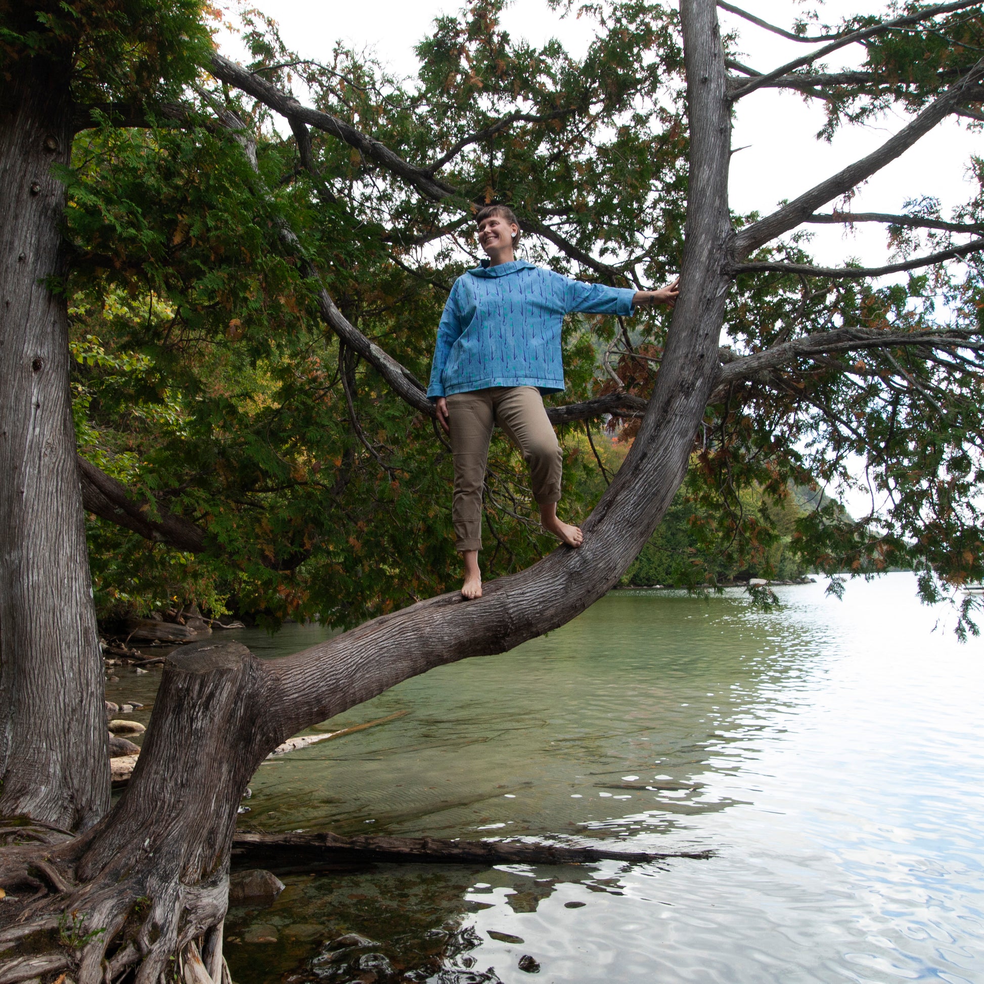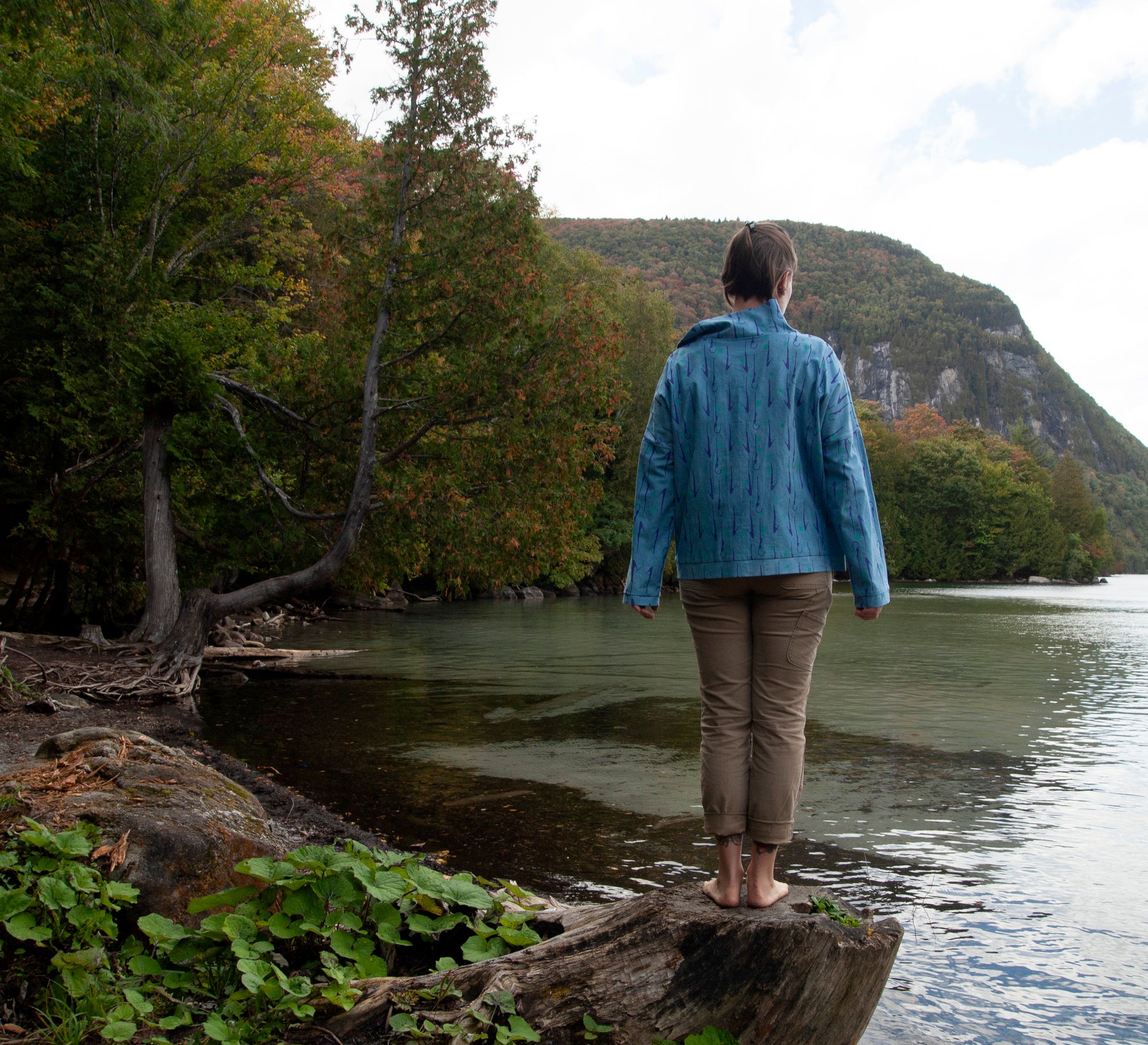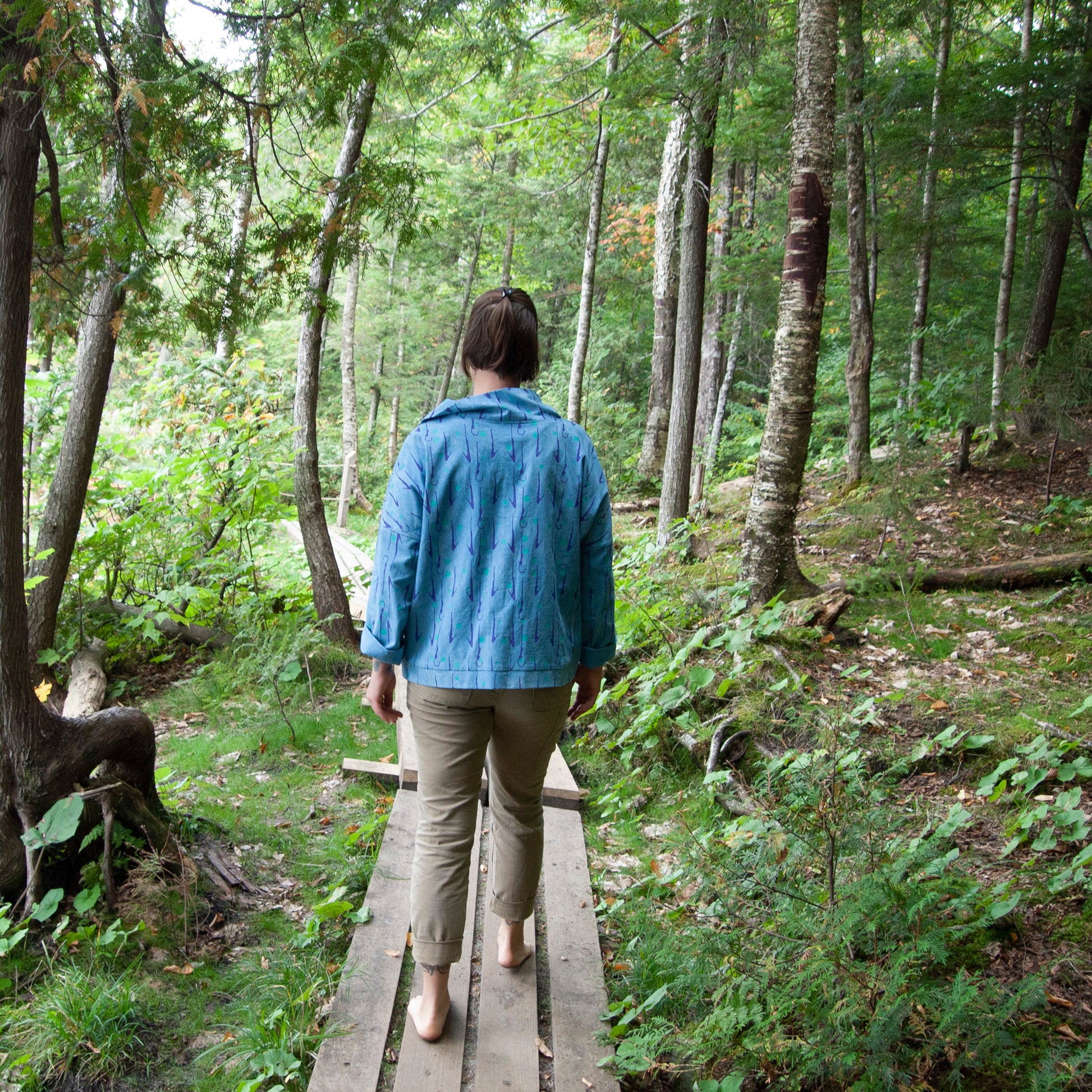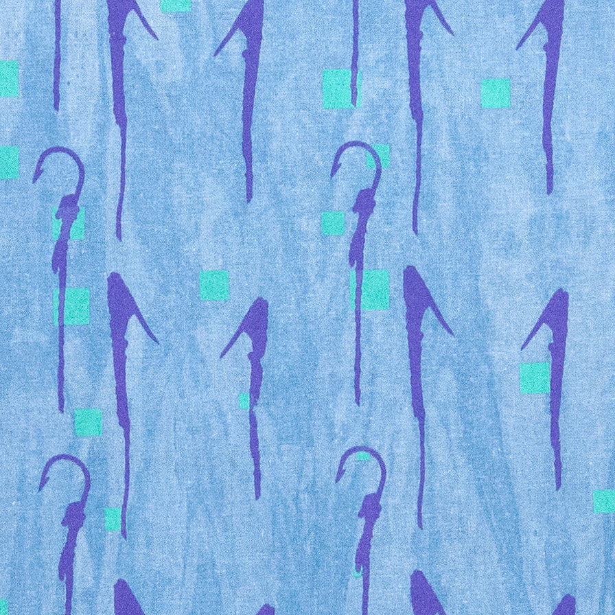100% linen hand dyed all natural indigo in a mottled style then silkscreened by hand with turquoise pixel squares and purple hand tied fish hooks. Linen is very soft already and only gets softer with wear.