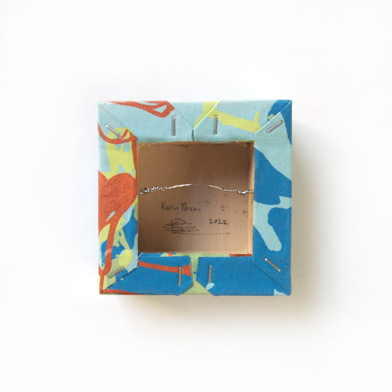 A piece of Better Than Jam fabric is adhered to a 4" x 4" birch panel frame. The fabric is first coated in a UV light protectant, then meticulously hand painted with acrylic paints in tiny detail adding extra pattern and color. A final gloss coating is applied to protect the details, and a wire cord is added to the back for hanging.