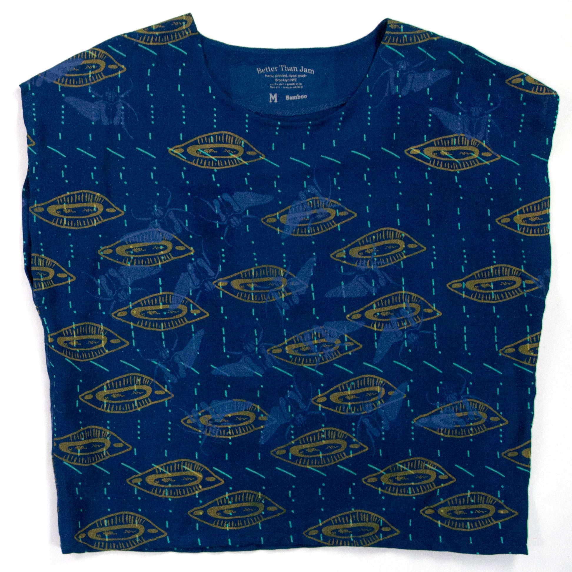 Handdyed with all natural organic indigo to start. Washed and set. Then hand silkscreened with originals designs and cured for washability. Teal morse code, mustard yellow almond shells, and periwinkle goliath beetles.