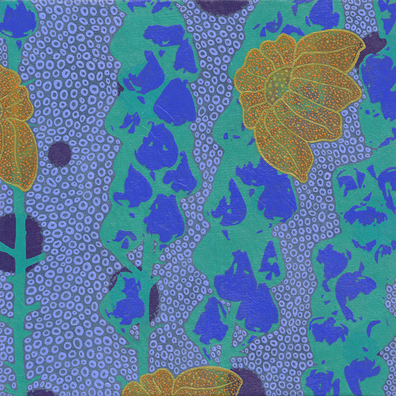 A piece of Better Than Jam fabric is adhered to a 8" x 8" birch panel frame. The fabric is first coated in a UV light protectant, then meticulously hand painted with acrylic paints in tiny detail adding extra pattern and color. A final gloss coating is applied to protect the details, and a wire cord is added to the back for hanging.