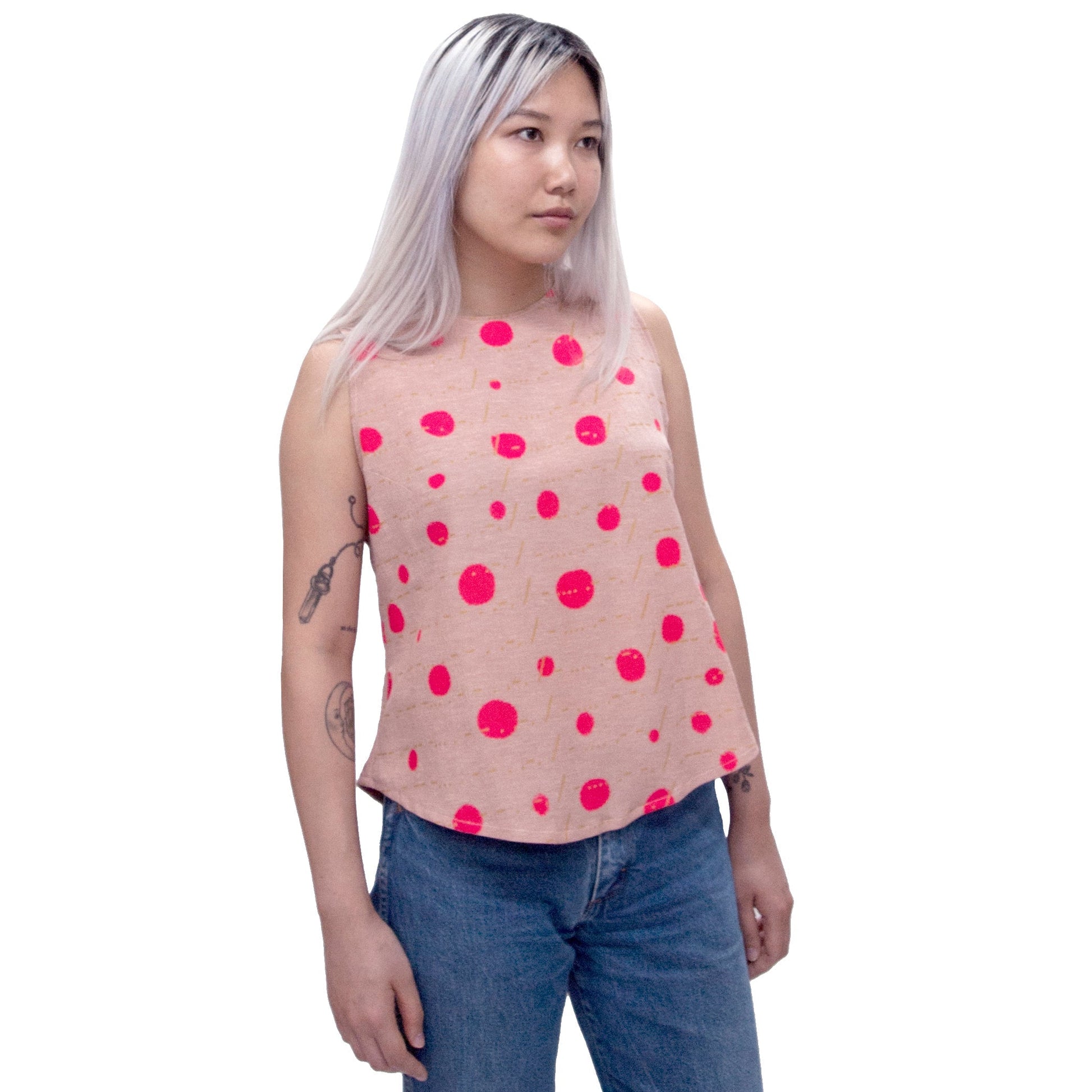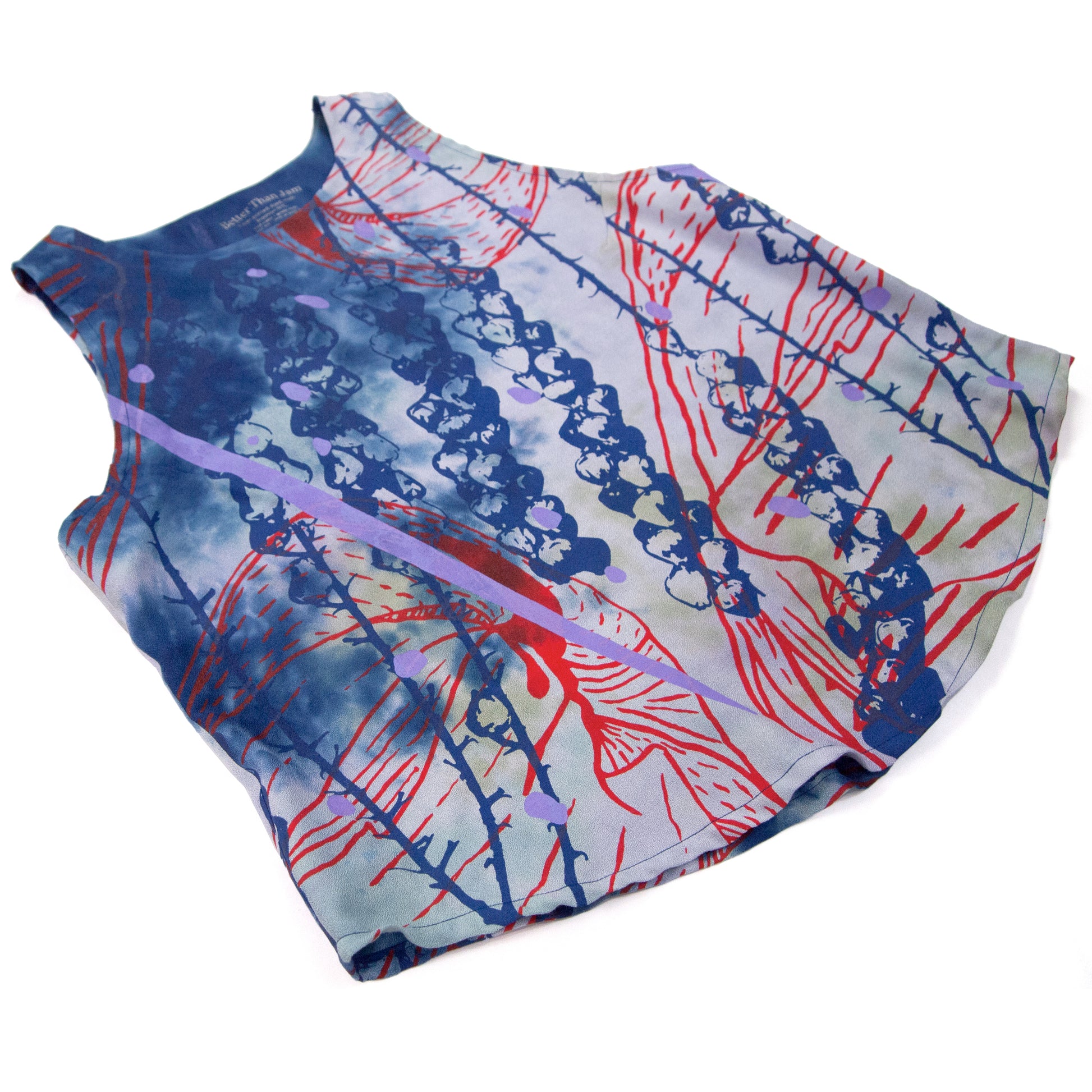 100% bamboo viscose rayon is a light weight fiber that mimics silk but is vegan friendly. Its is dyed with blend of fiber reactive dyes for a mix of cool colors. Hand printed with Red coconuts, Light Purple fawn markings, + Navy blue bell flowers.