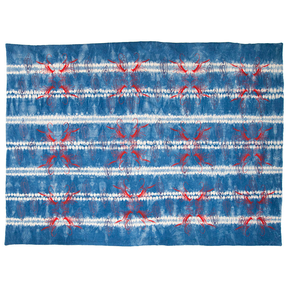 Hand-stitched shibori techniques used and then hand-dyed in indigo dye. Thoroughly washed 3 times and fixed. Then I hand silkscreened 2/3 times, layering the different images; of metallic mauve almond shells and scarlet red crayfish. Images/patterns are original designs of mine, that are hand drawn, original photographs, or digitally manipulated objects.