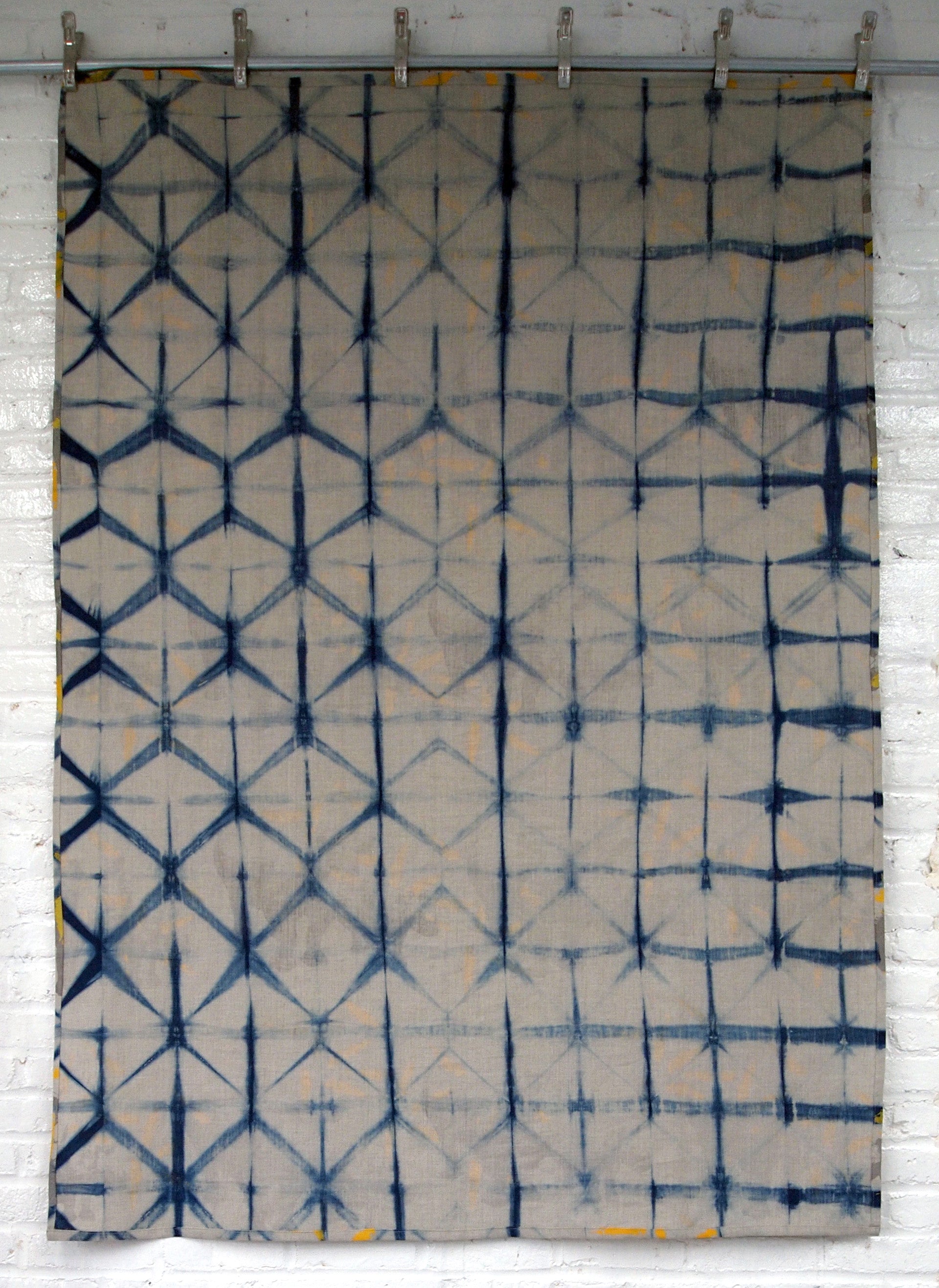 First I hand dyed the linen in Indigo using shibori folding and sewing techniques.