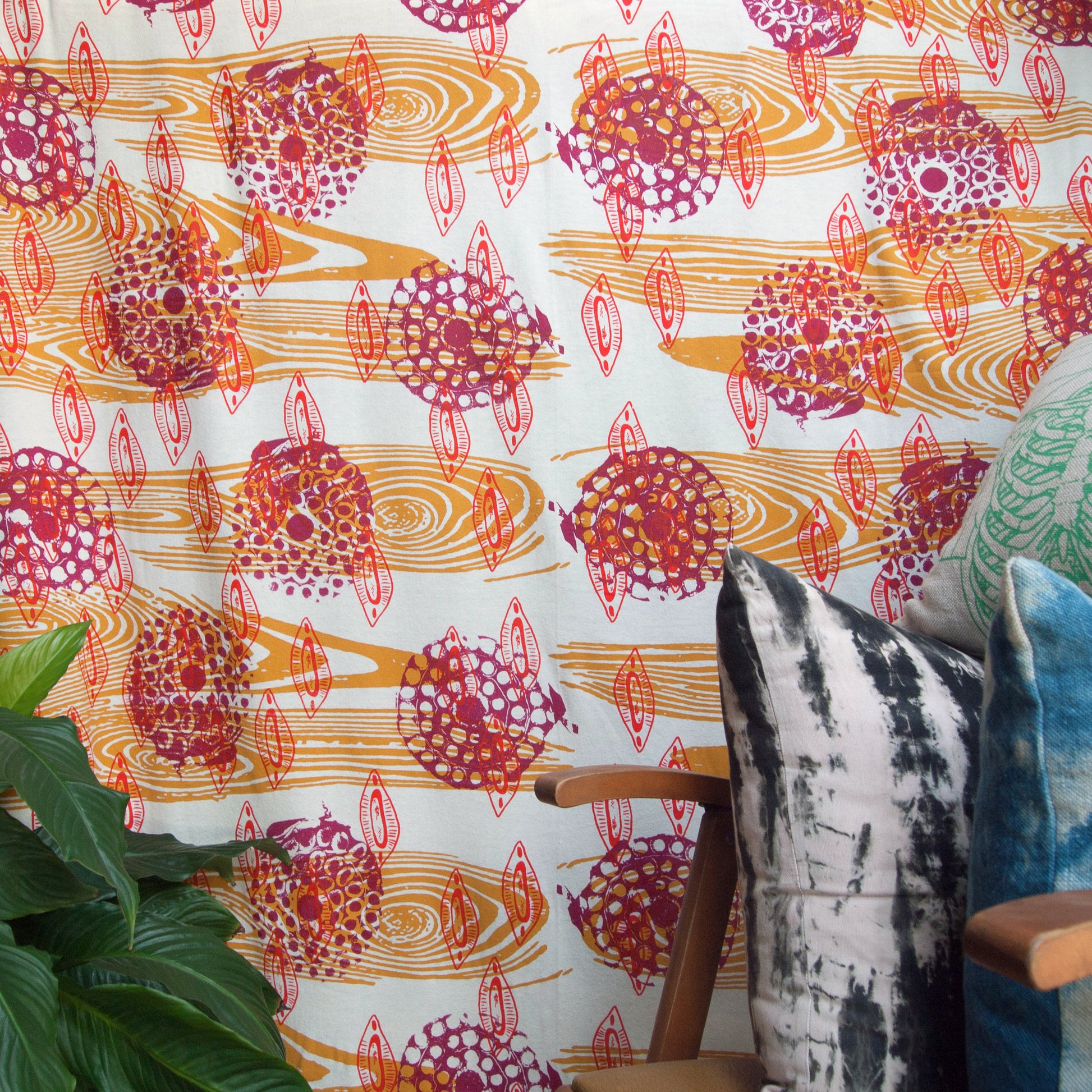 Hand printed with: Mustard yellow wood grain, Magenta firework remnants, + Scarlet red almond shells