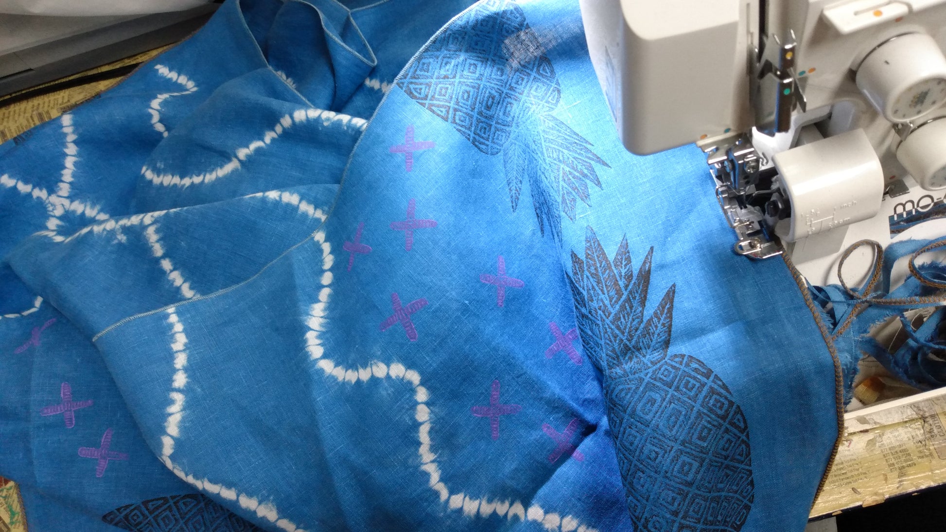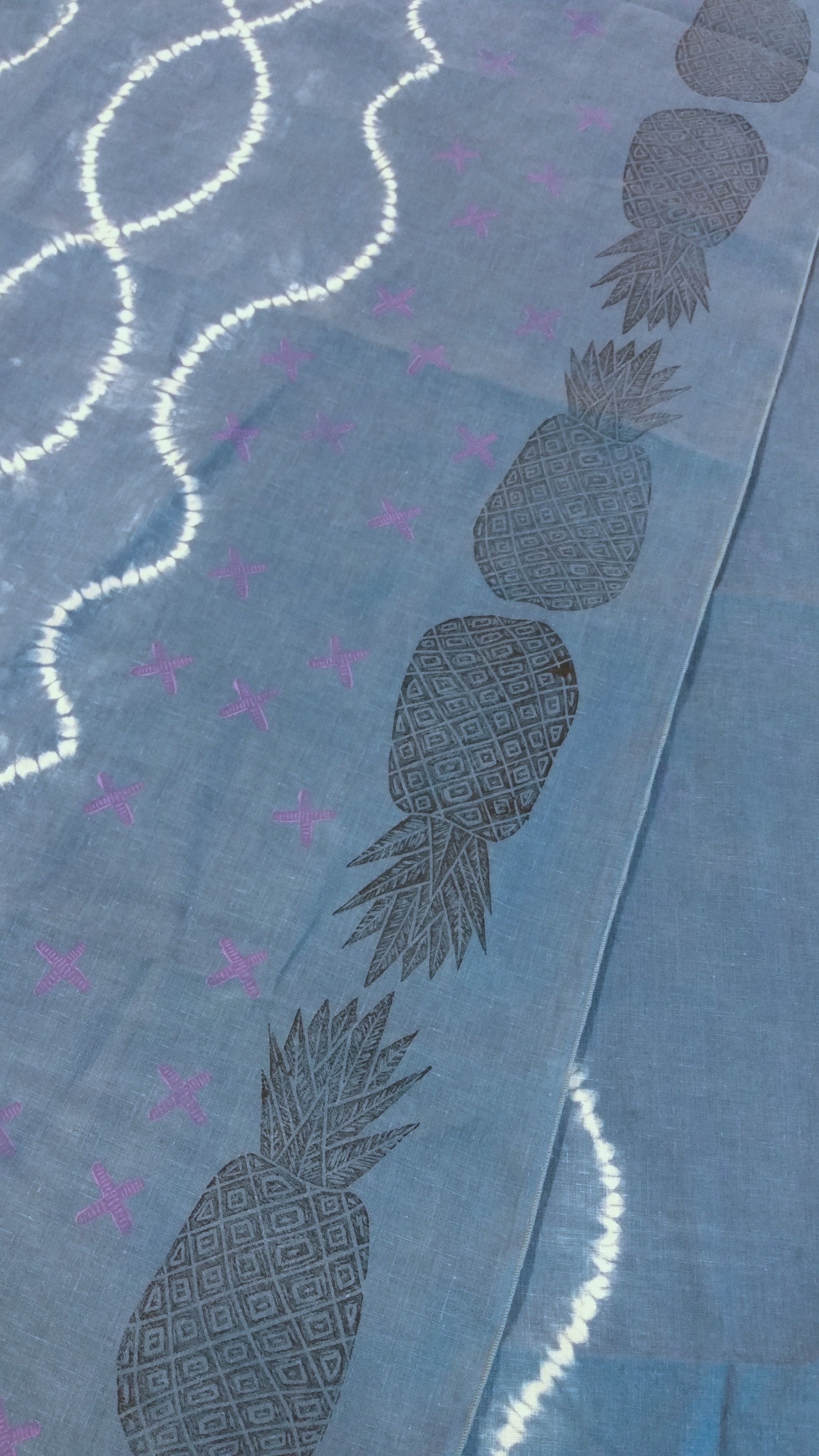 This beautiful linen was first hand dyed in organic all natural indigo, then blockprinted by with hand-carved block of original artwork.
