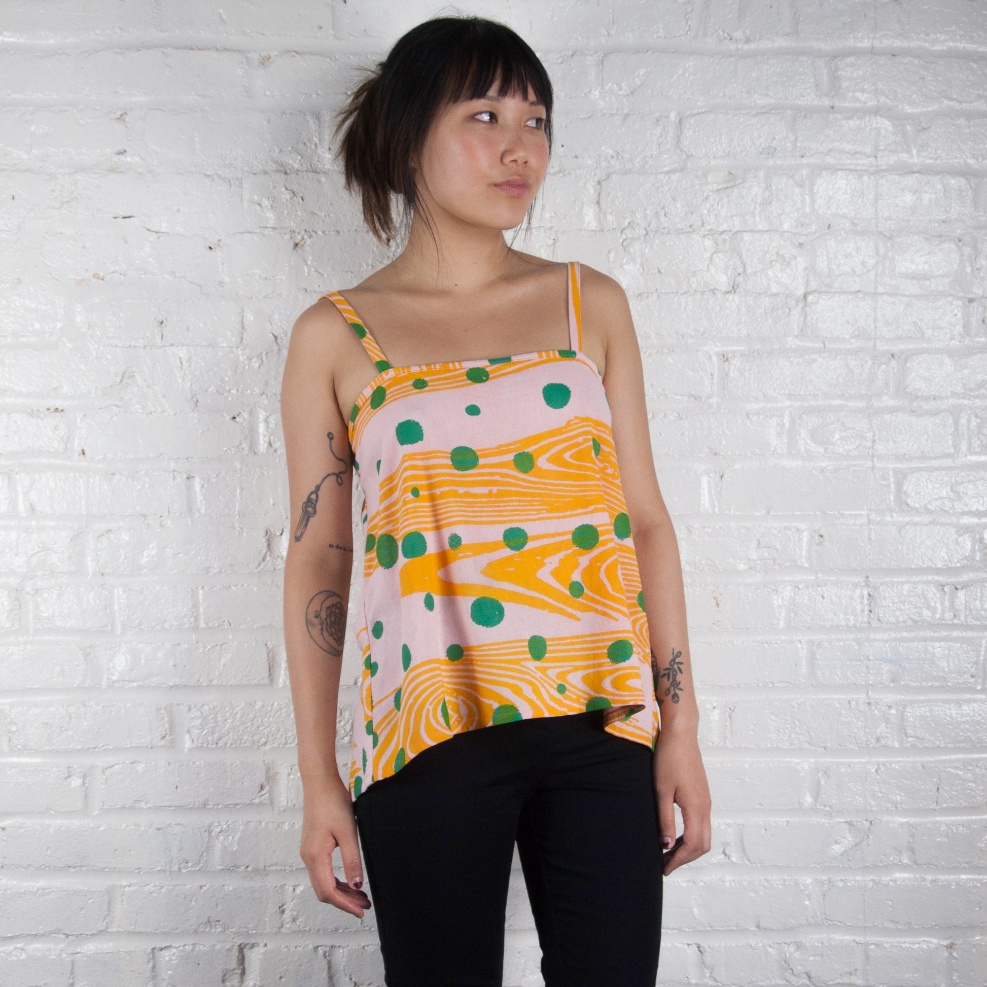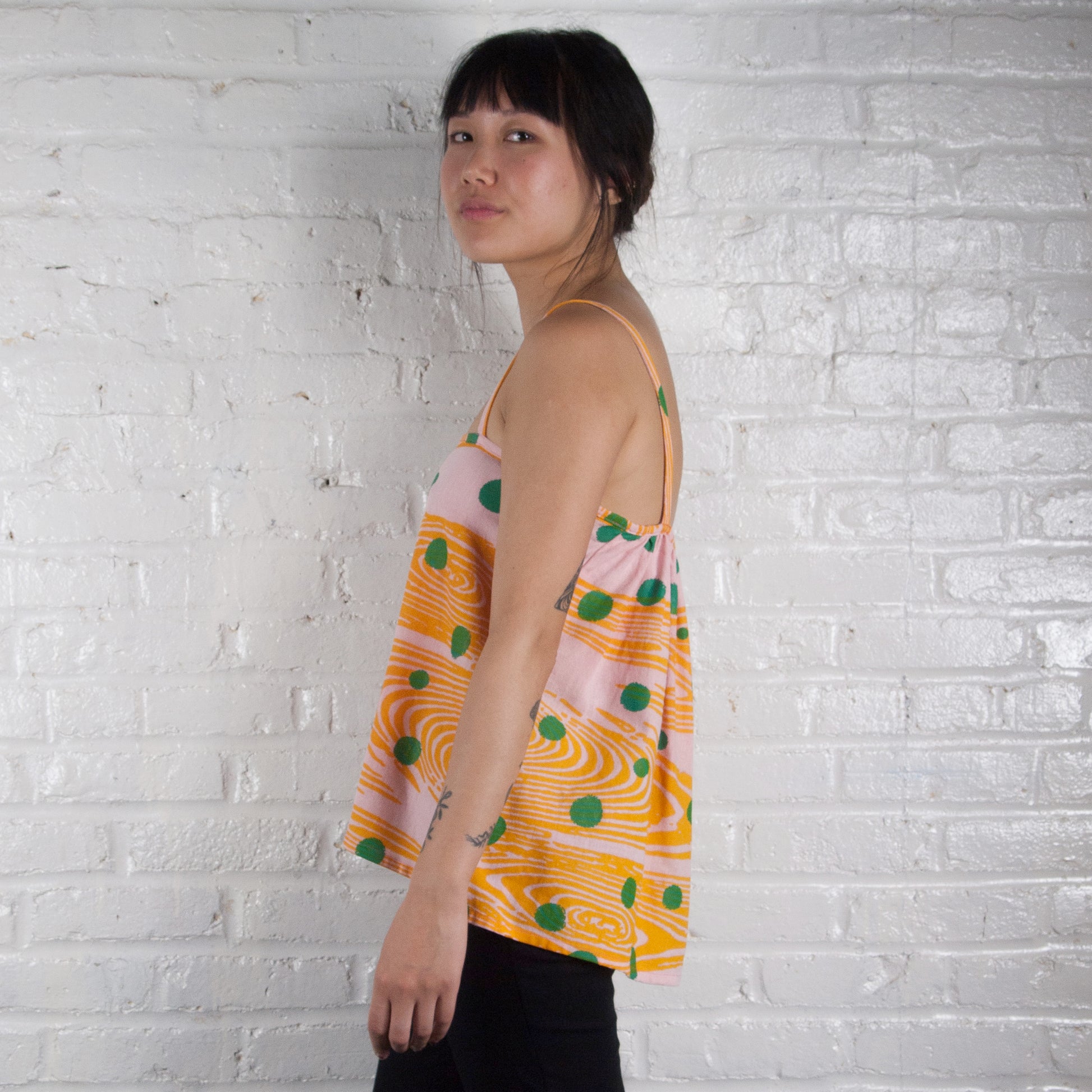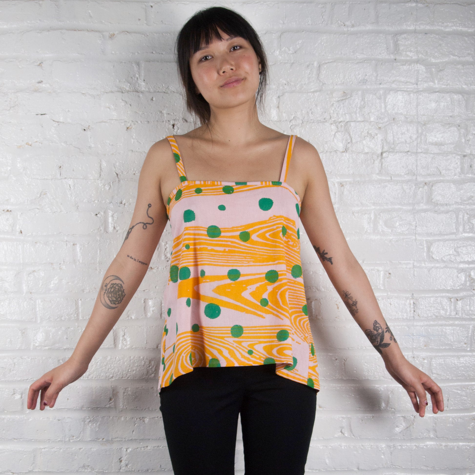 Linen/cotton fabric is screenprinted by hand and naturally dyed in prereduced indigo.