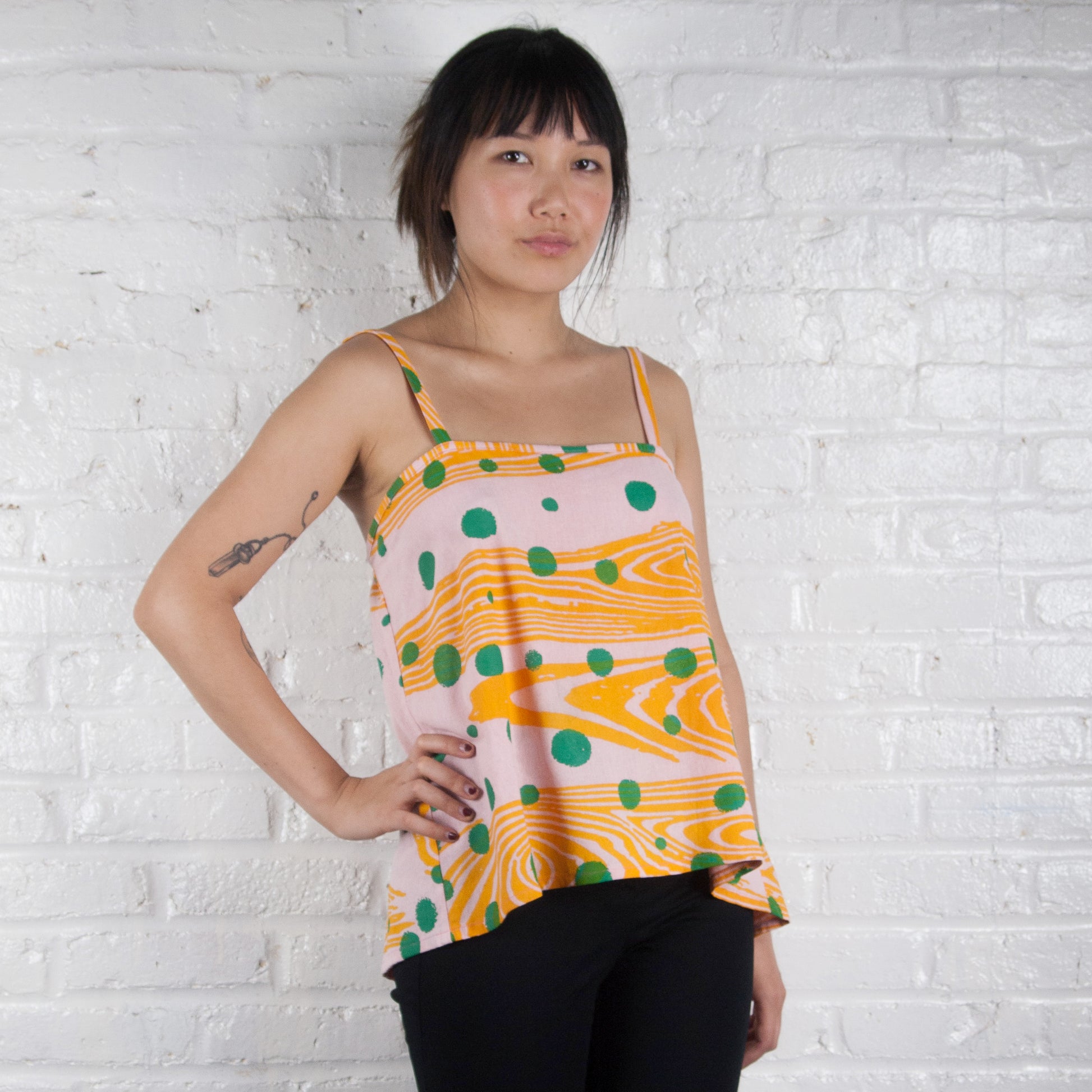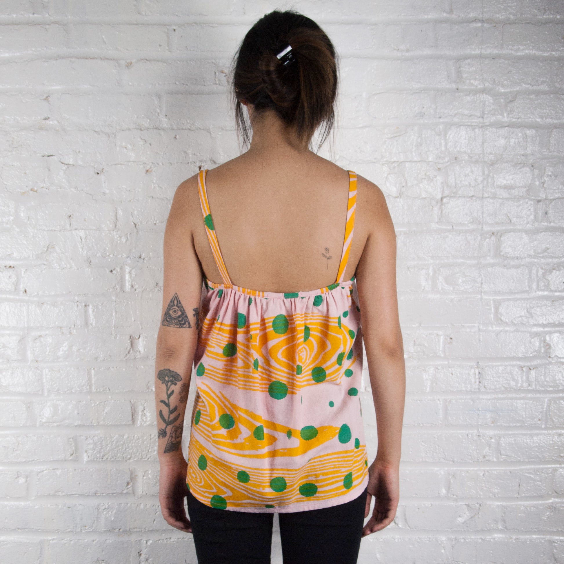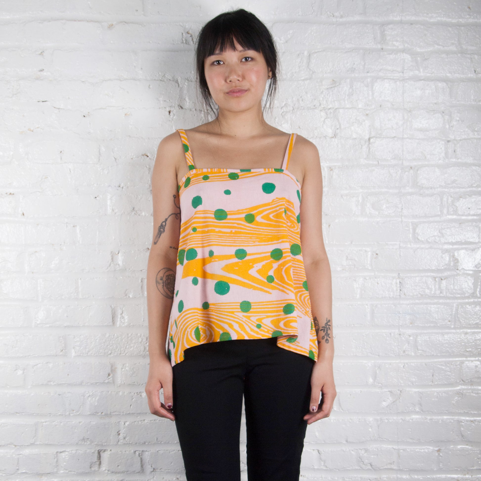 Linen/cotton fabric is screenprinted by hand and naturally dyed in prereduced indigo.