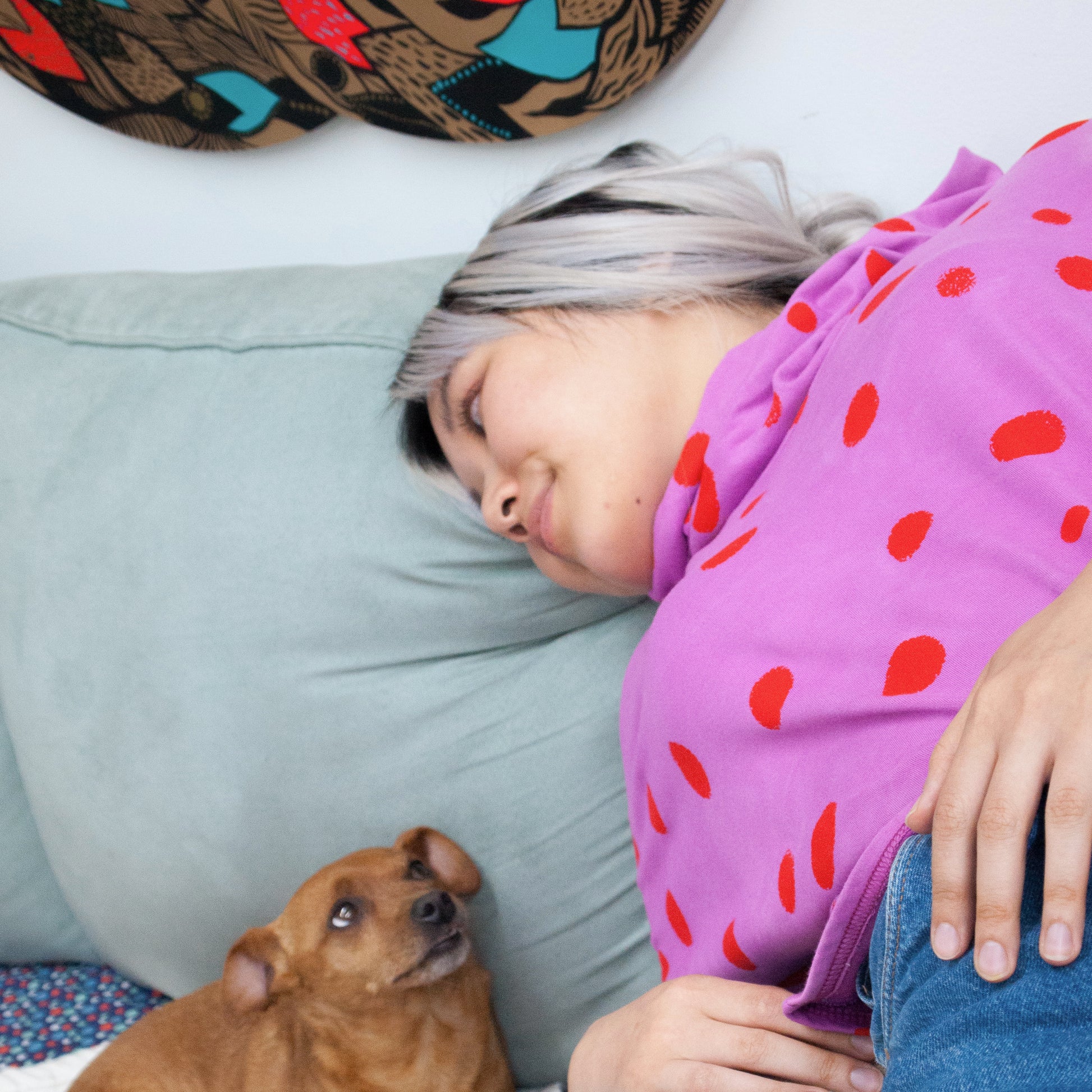 Fabric is (mostly) first hand dyed in fiber reactive dyes, washed and set. Then silkscreened by hand in house using my original designs. No fabric is ever replicated so each piece is completely original. 4-6 are made from the same printed yardage, yet each is completely unique because the pattern lays differently on each piece. The version that wears like a top is created with a medium weight linen or blend. While the cozier version that wears like a sweatshirt is created with a medium weight jersey bamboo blend or a thicker all natural hemp cotton fleece.