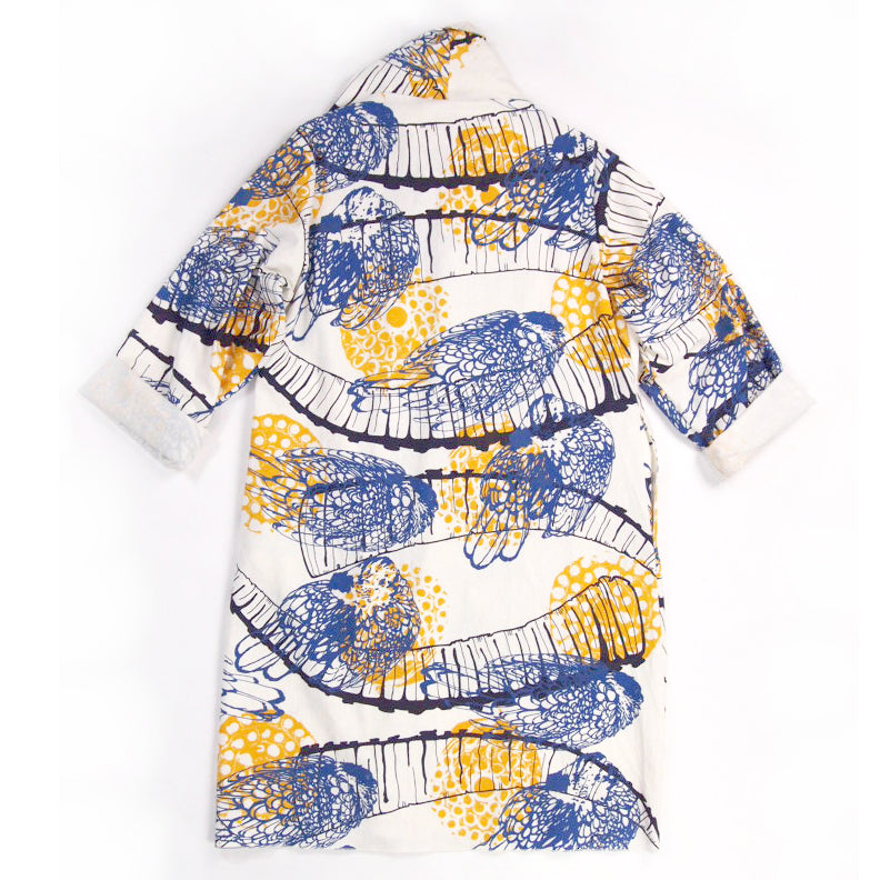 DUSTER: white linen cotton printed ochre yellow, navy, periwinkle