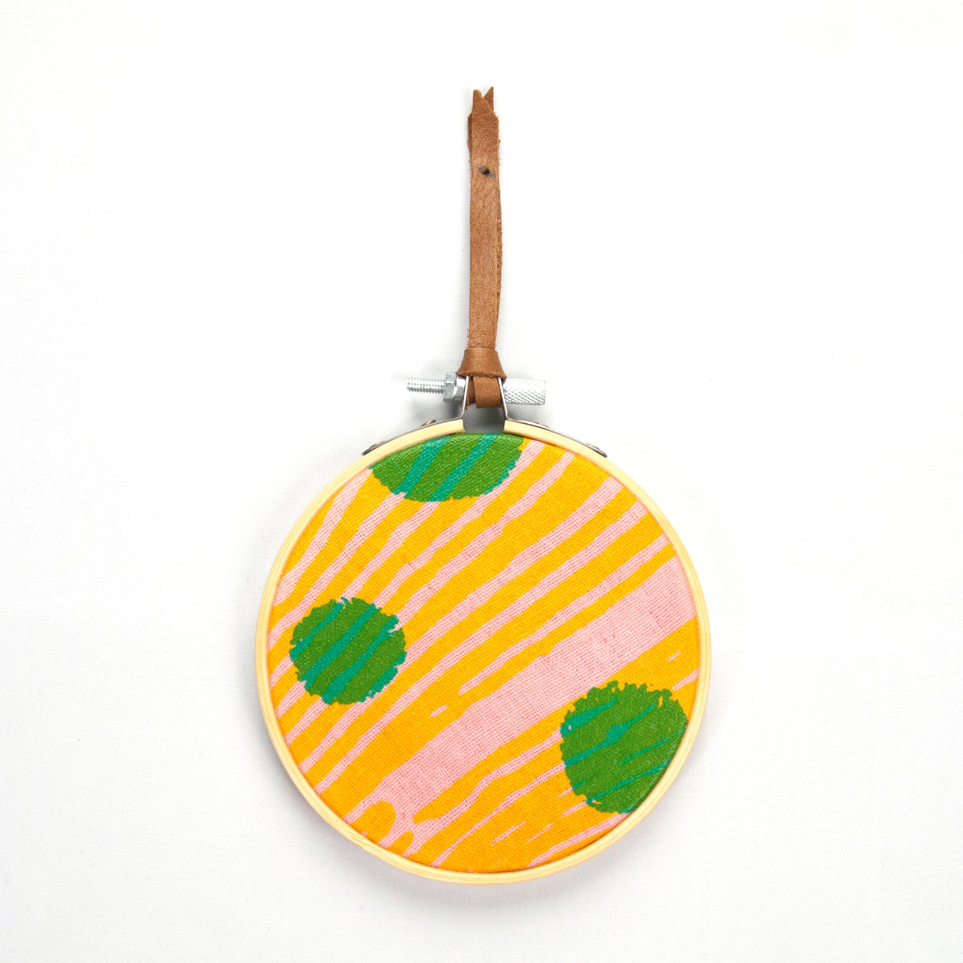 Each piece is carefully stretched into the ring and sewn tightly in the back, then coated with the UV protective gel coating, and then a piece of fabric is hand stitched to the backing for a clean look. The straps are handcut from a rescued piece of leather, then hole punched, so you can easily hang it with a single nail. The best look is with an extra long carpet tack.