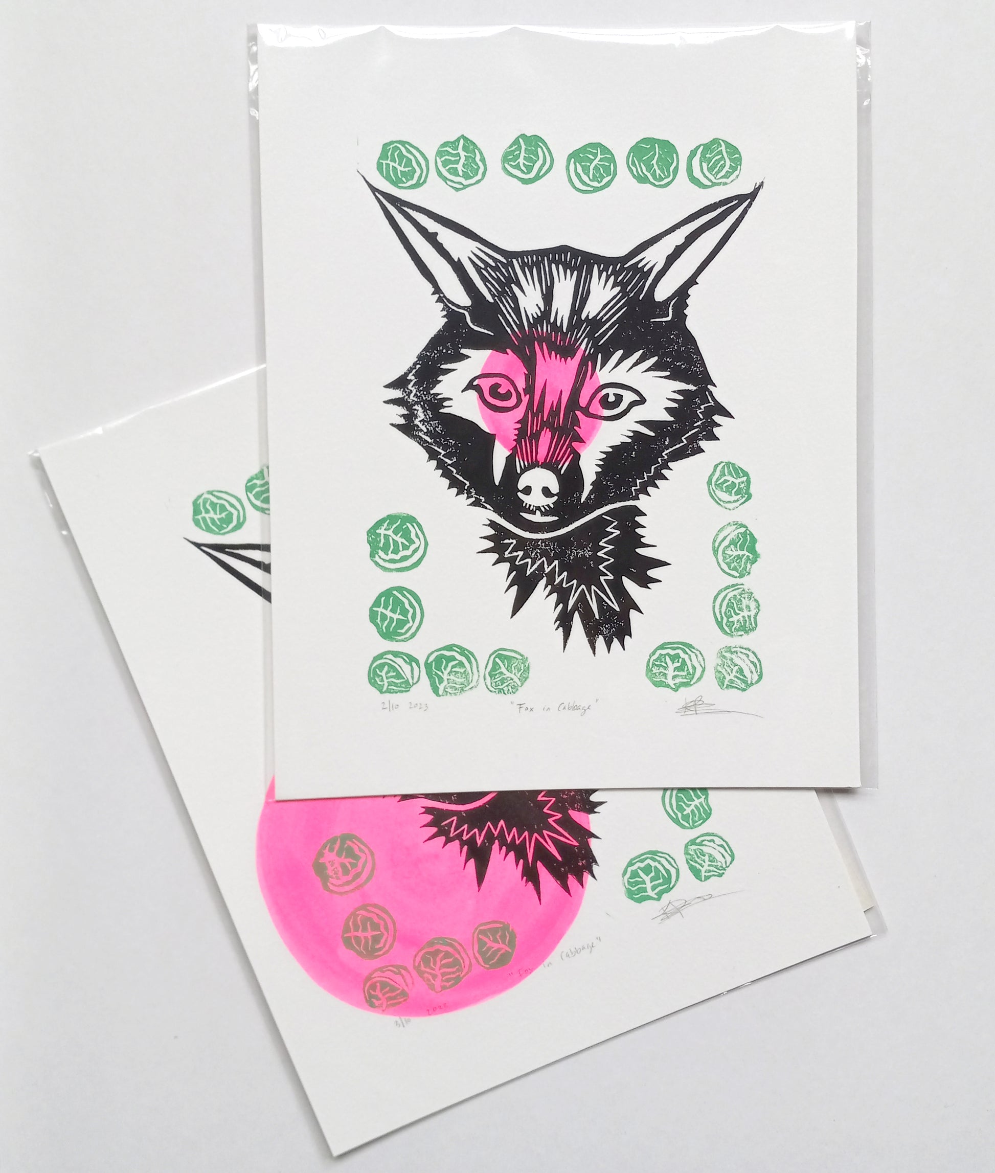 1 of 10 signed 2 color linoleum prints. Black and green blockprint and handpainted color behind.