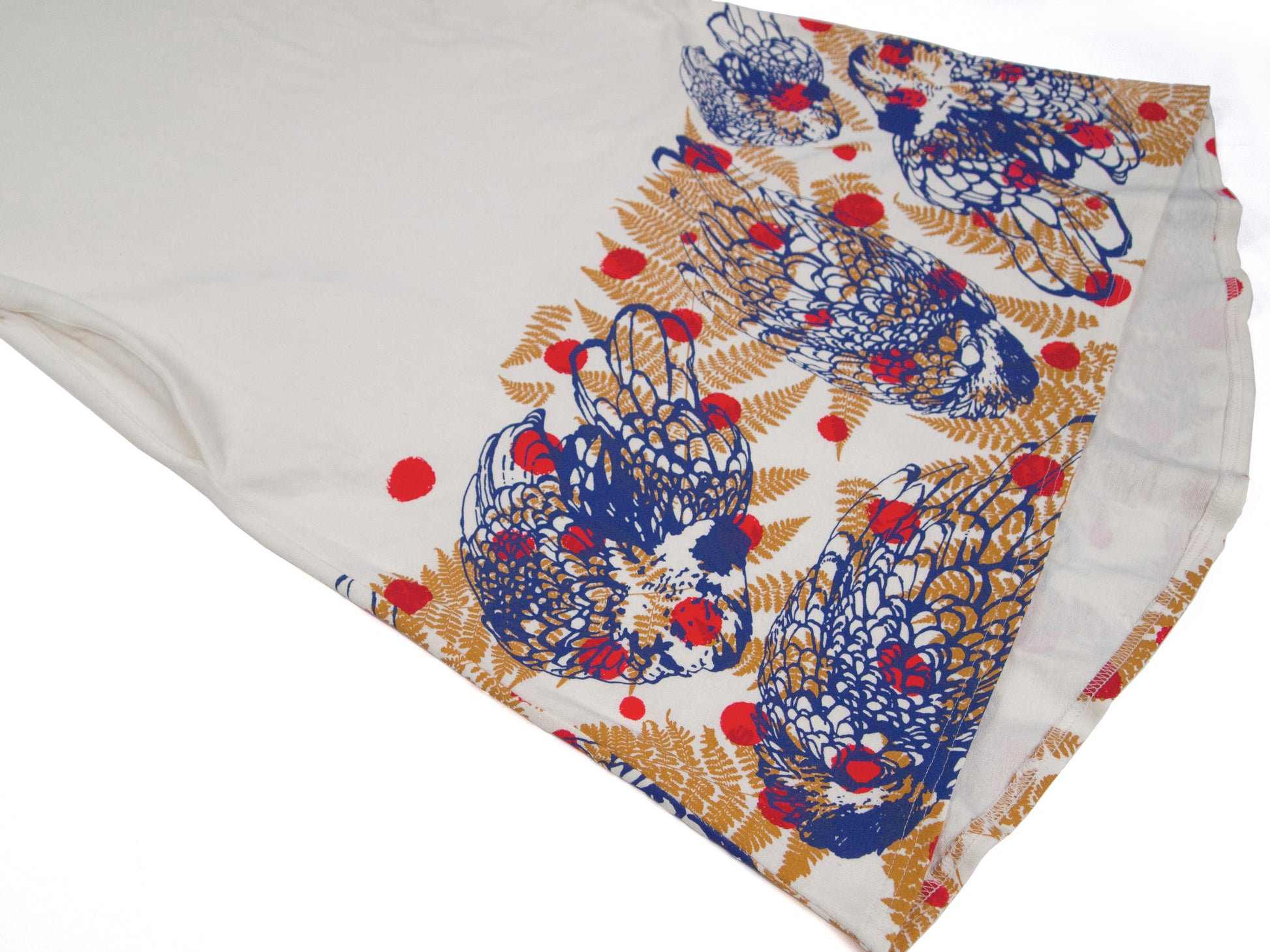 Printed just along the bottom, both back and front, before sewing. Handprinted with mustard yellow ferns, periwinkle chickens + scarlet red polka dots.