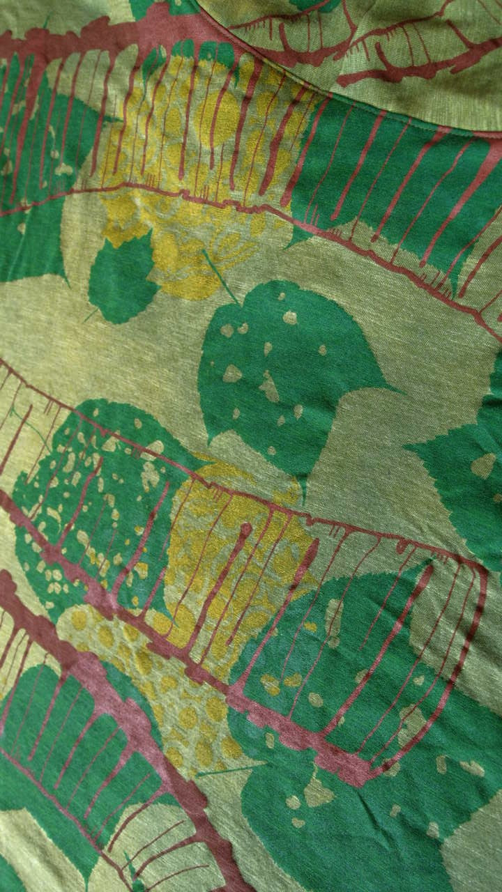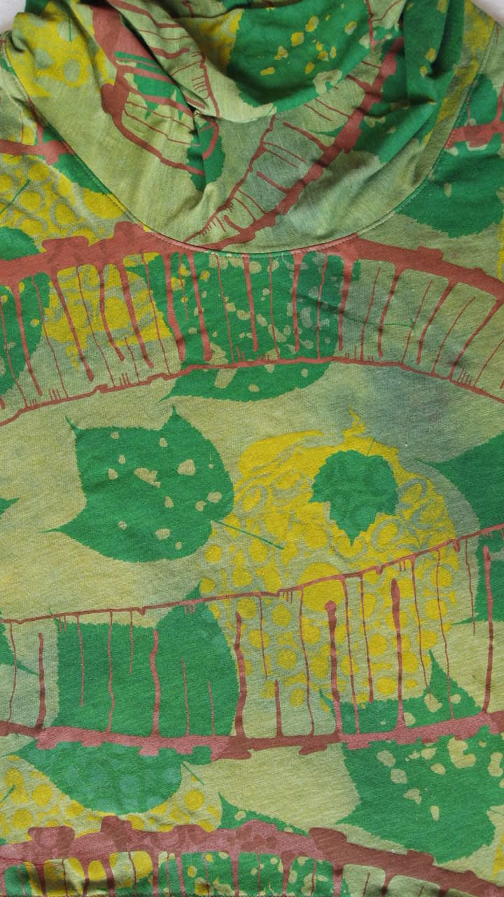 Recycled jersey is first hand dyed with different green procion dyes. I then printed with green leave, brown ibex horns, and yellow firework remnants.