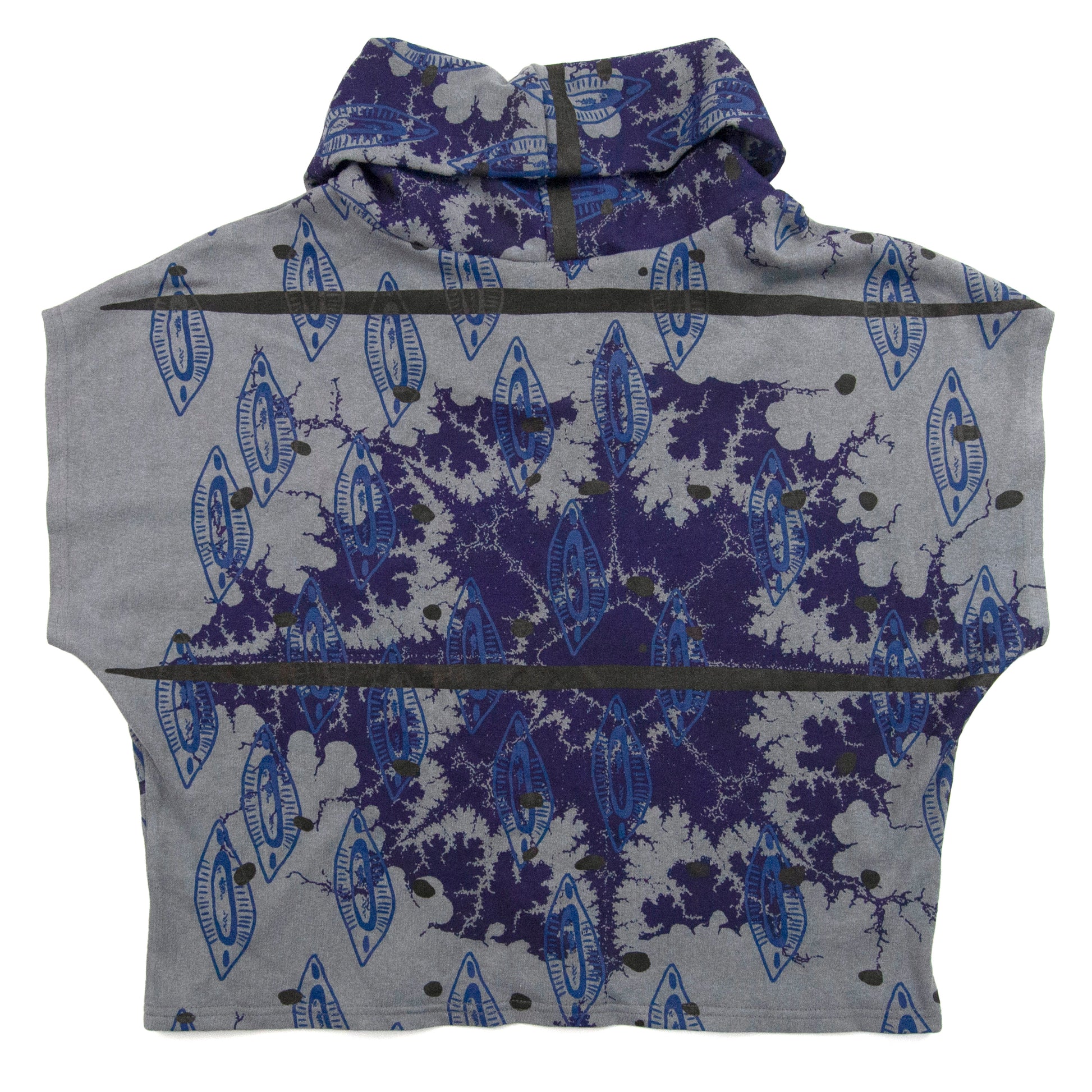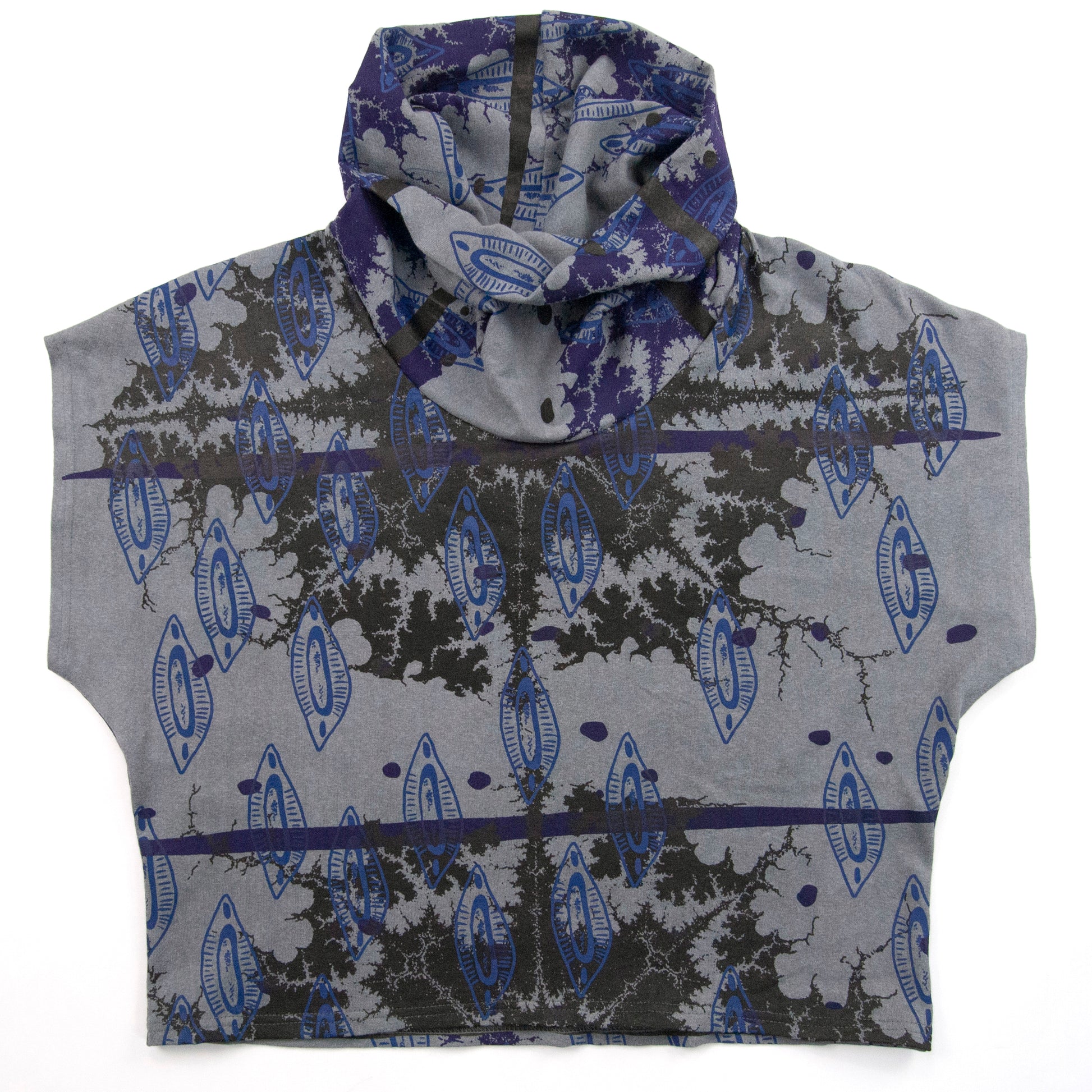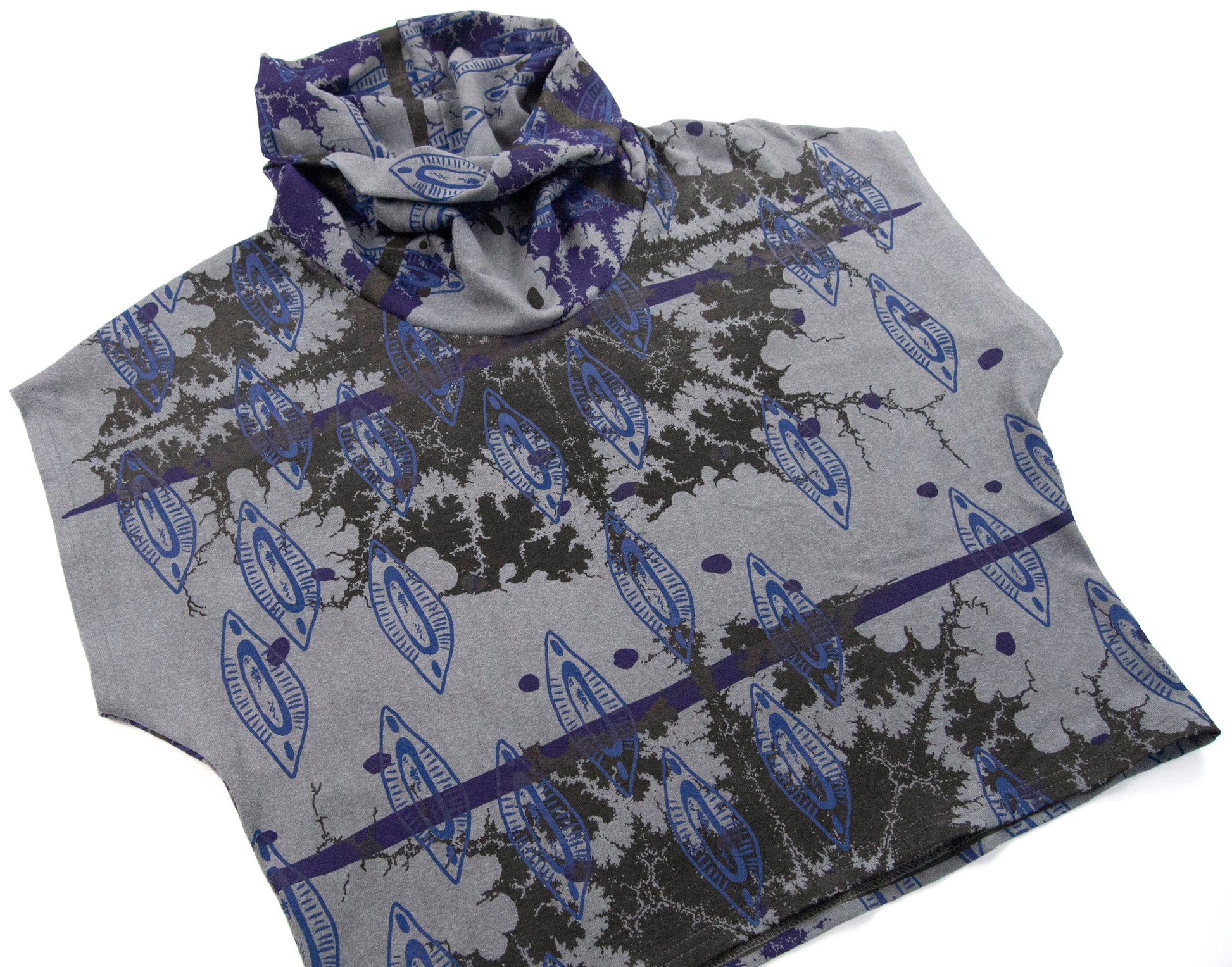 (Front) Grey dyed fabric Hand printed with: Purple Mandelbrot fractals, Periwinkle almond shells, Black fawn markings. AND ALSO (back) Hand printed with: Black Mandelbrot fractals, Periwinkle almond shells, Purple fawn markings.