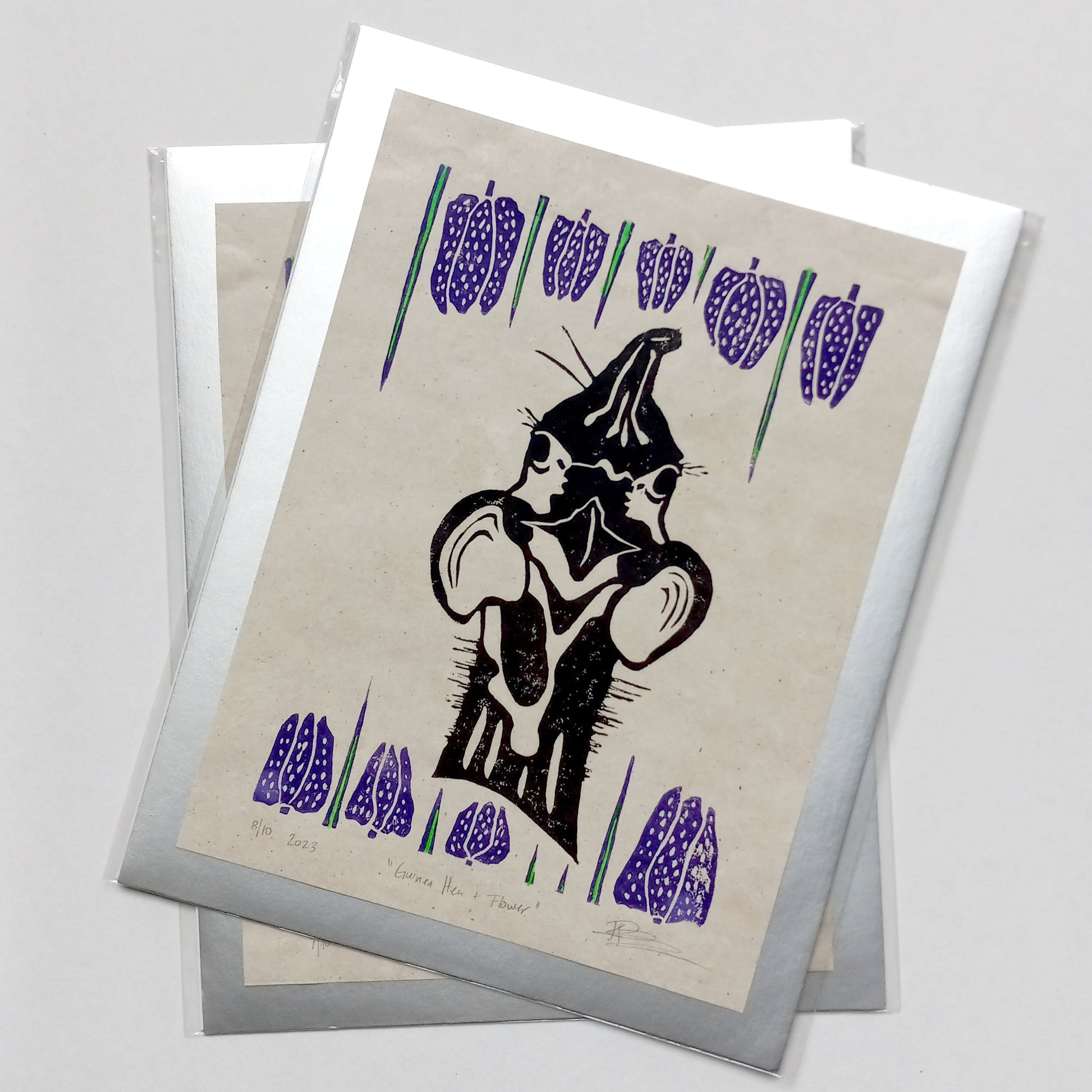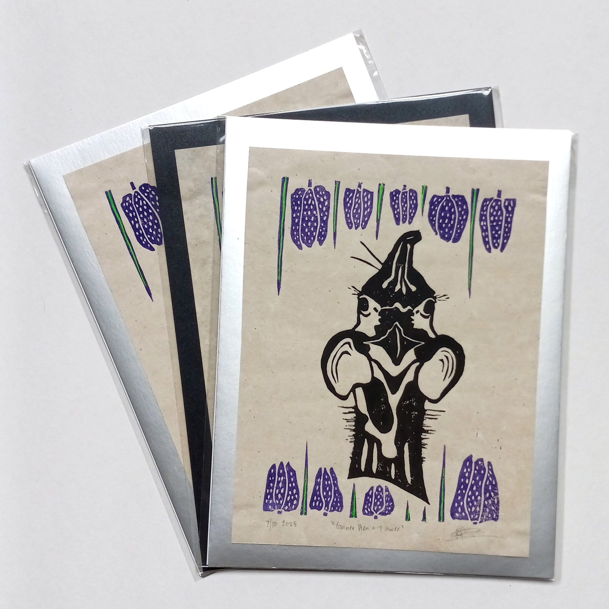 1 of 4 signed 2 color linoleum prints. Black and green blockprint and handmade paper.