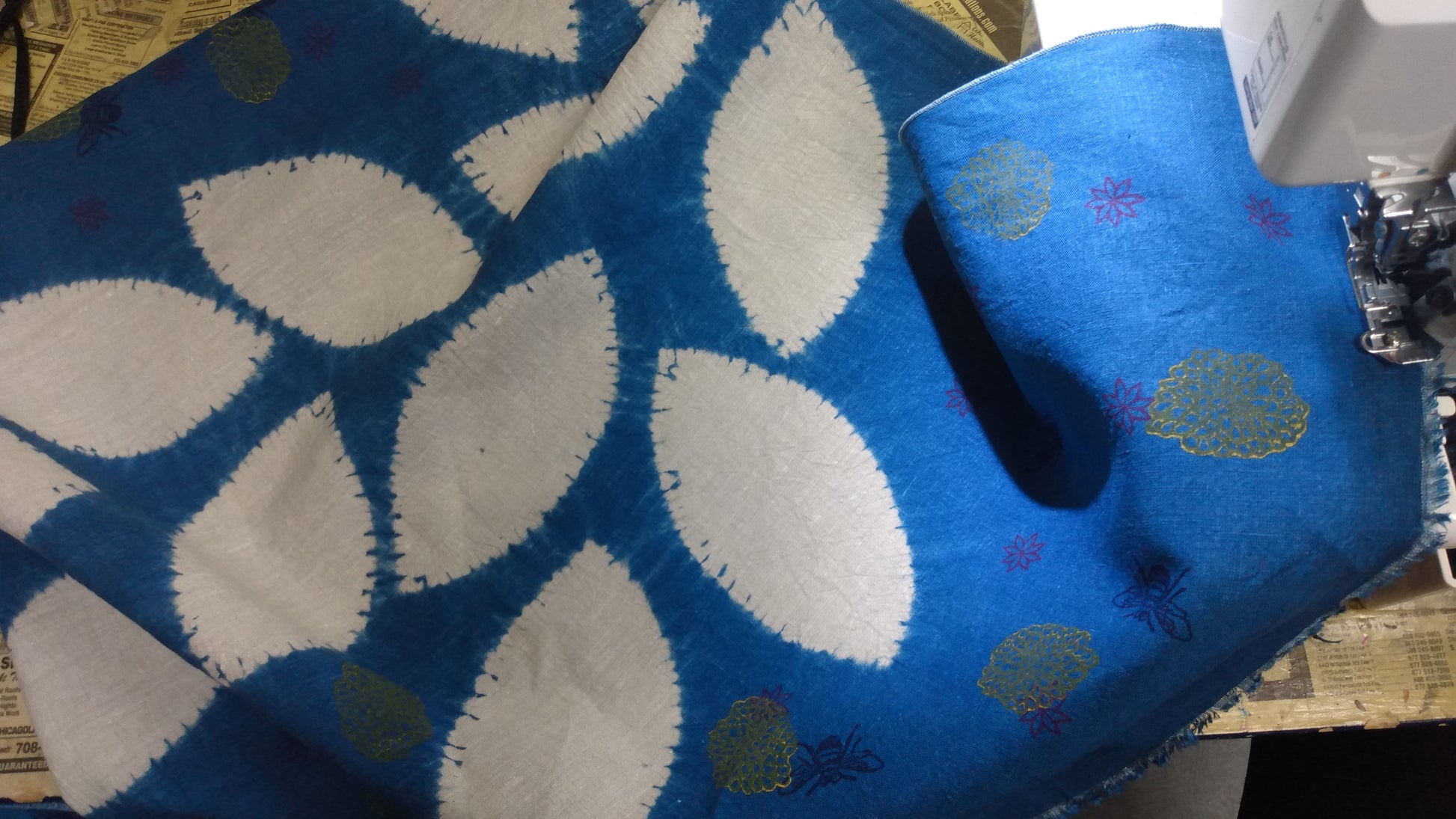 This beautiful linen was first hand dyed in organic all natural indigo and stitching technique, then blockprinted by with hand-carved block of original artwork