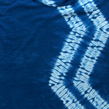 Hand stitched shibori design (waves), dyed in organic indigo then over dyed with recycled light blue and teal reactive dyes in a mottled style so it shows texture.