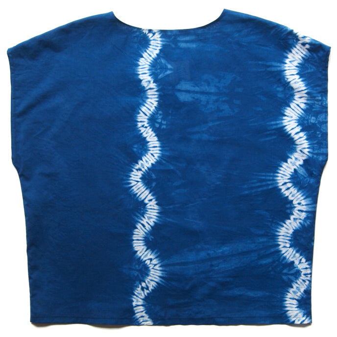Light fabric is first hand stitched in two rows, two stitch paths each, then pulled tightly and dipped in succession to produce a medium indigo blue. Then unstitched to reveal the pattern. Fixing and washing is done carefully so there is no bleeding and also minimal fading. Once dry the fabric is laid out and the top pattern cut, then sewn. Very specially there is only one of these tops. So size is obviously limited.