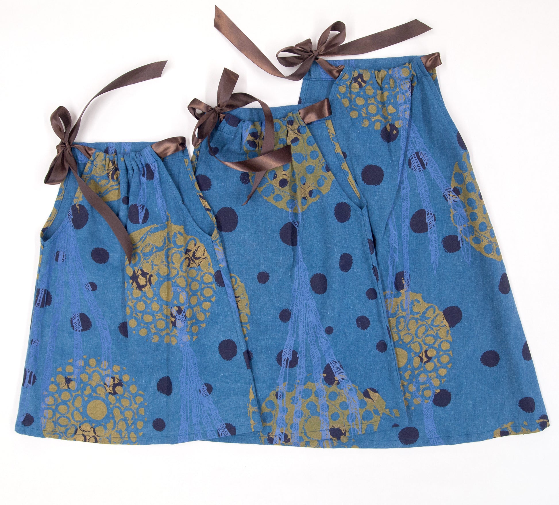 Handprinted fabrics with adjustable ribbon closure. 100% linen hand dyed in natural dyes with water based screenprinting ink. Wash in cold water and linen dry, but they will not shrink because the fabric is dyed before sewing. The ribbons are sewn into the back of the collar so you won't loose them.