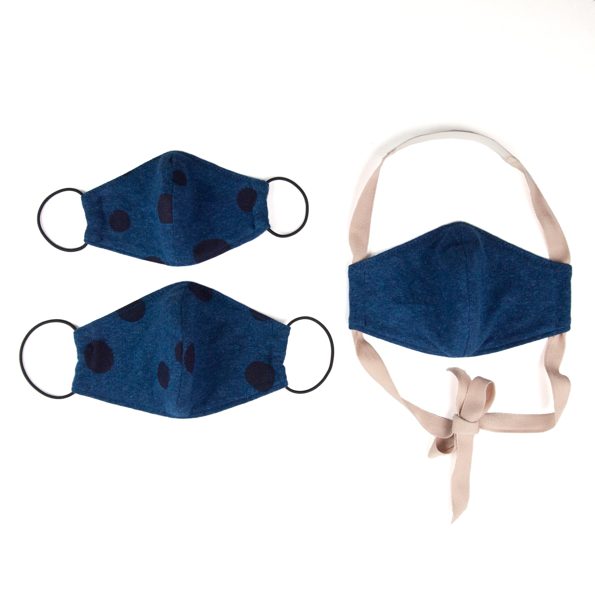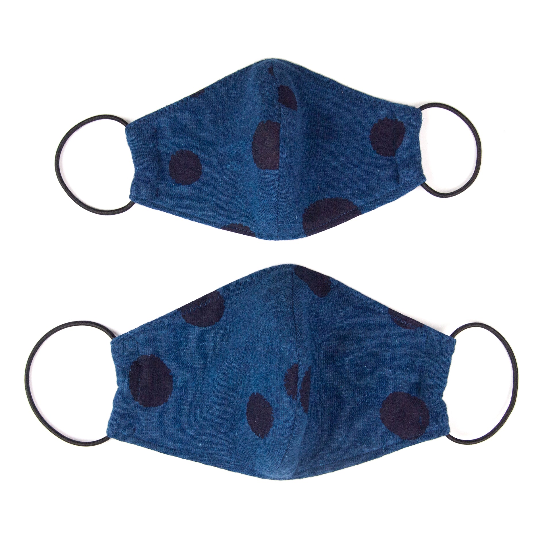 Bamboo Hemp jersey front is hand dyed with all natural organic indigo dye. Some has polka dots silkscreened with water based textile ink. The lining is tight weave extra soft Egyptian cotton, that is a recycled fiber. The standard mask comes with 3mm elastic straps. You are sent the mask with extra long straps, loosely tied. Fit them to you head/face and tighten and slide the knot inside the fold-over. If you prefer, you can choose to have an over the head strap added instead. A piece of elastic has been added, to keep the strap in place and allowing a better fit. Without it we find the twill cotton cord will twist and slip off.