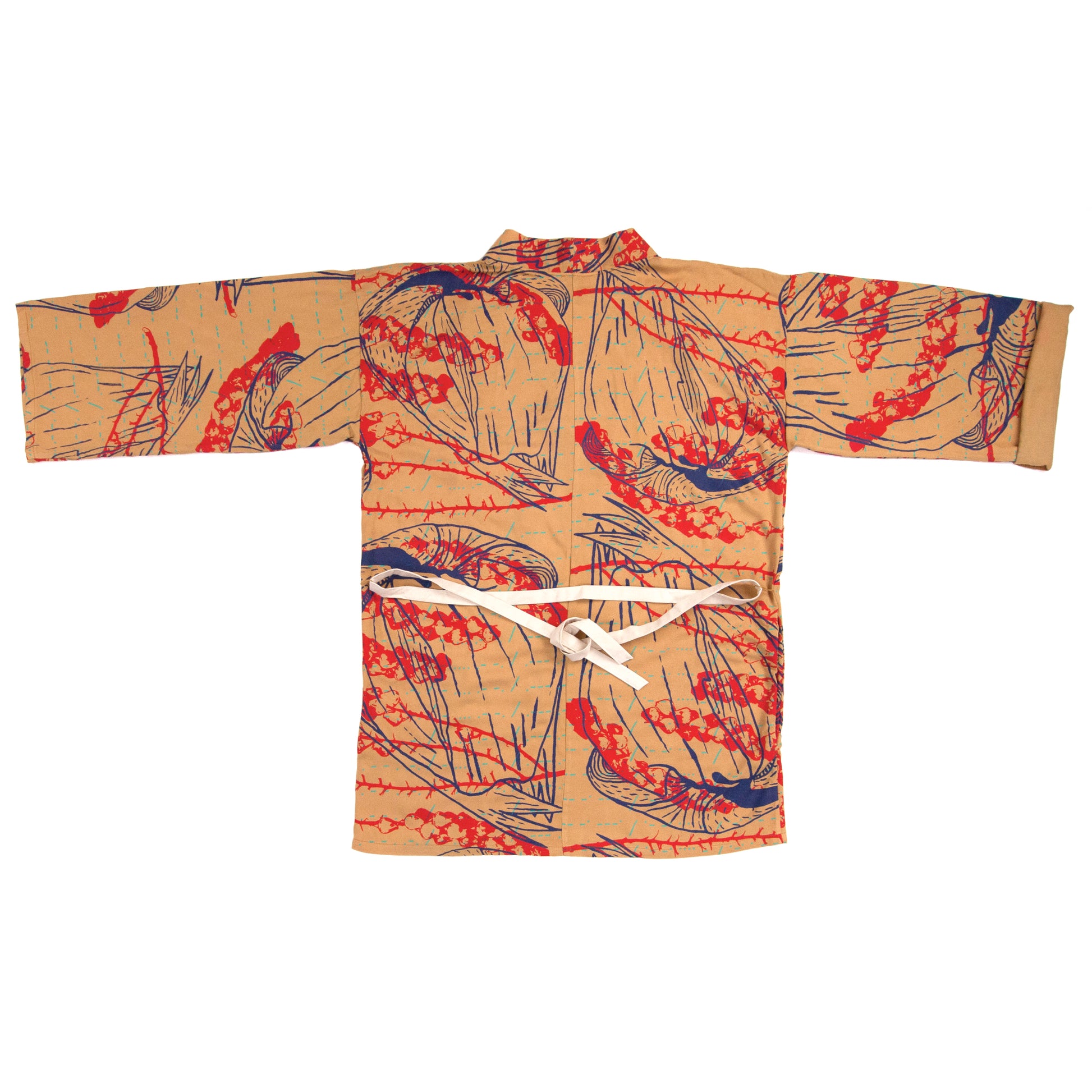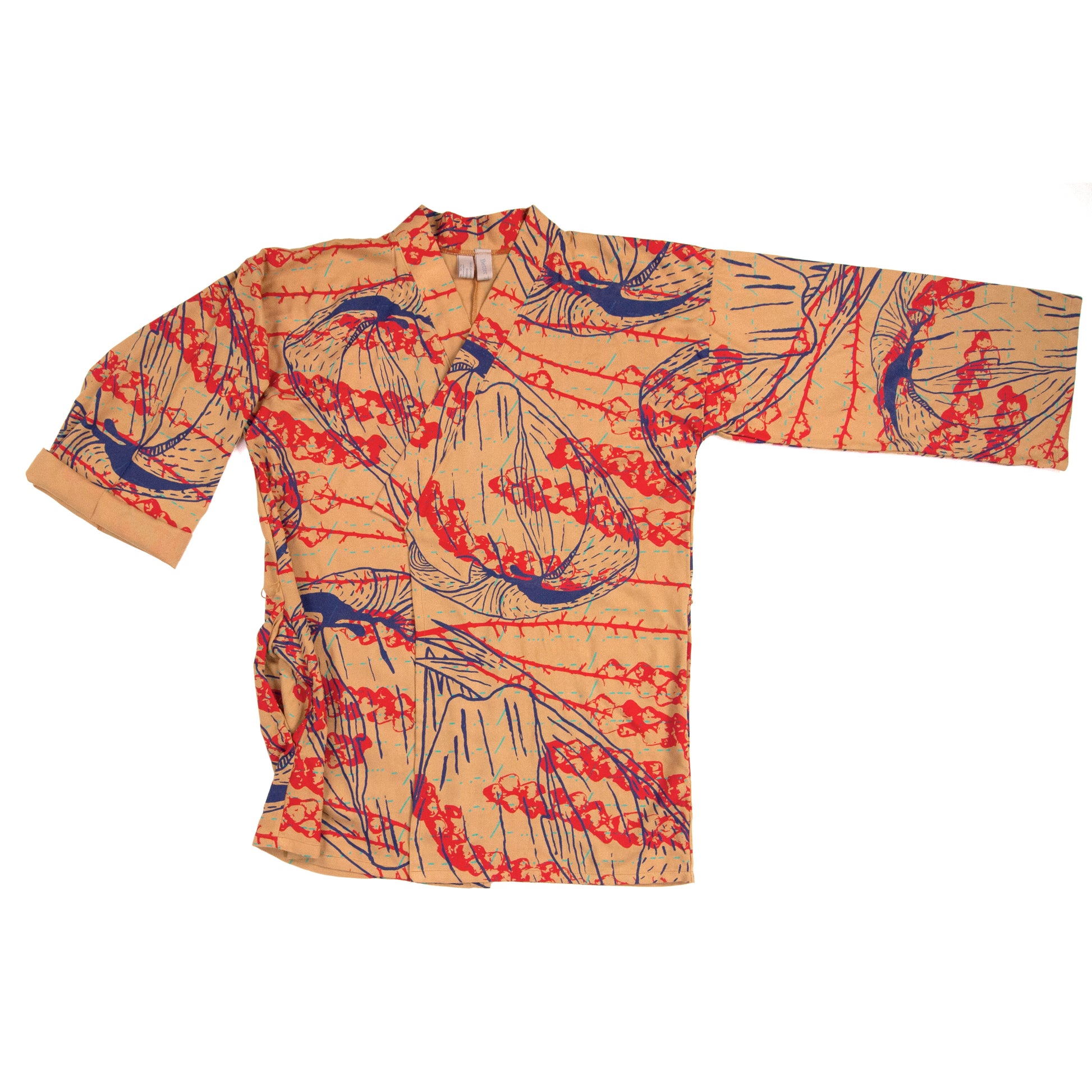 My new wrap! Inspired by a traditional kimono of Japan, my simplified pattern is sort of a mix of the female and male versions, so I hope that anyone will like to wear it. This "thing to wear" is meant to drape open, but ties if you want, with pockets hidden on each side. Make sure to wear left side wrapped over right, as the opposite the wearer would be deceased. What I've loved about some historical kimono I've seen is though a pattern may be simply created from straight lines, they are a moving exhibit for some of the most amazing fabrics; hand painted, printed and/or dyed the skill of hand is so great it's hard to fathom the artisans talent. I hope my textiles do the iconic shape justice.