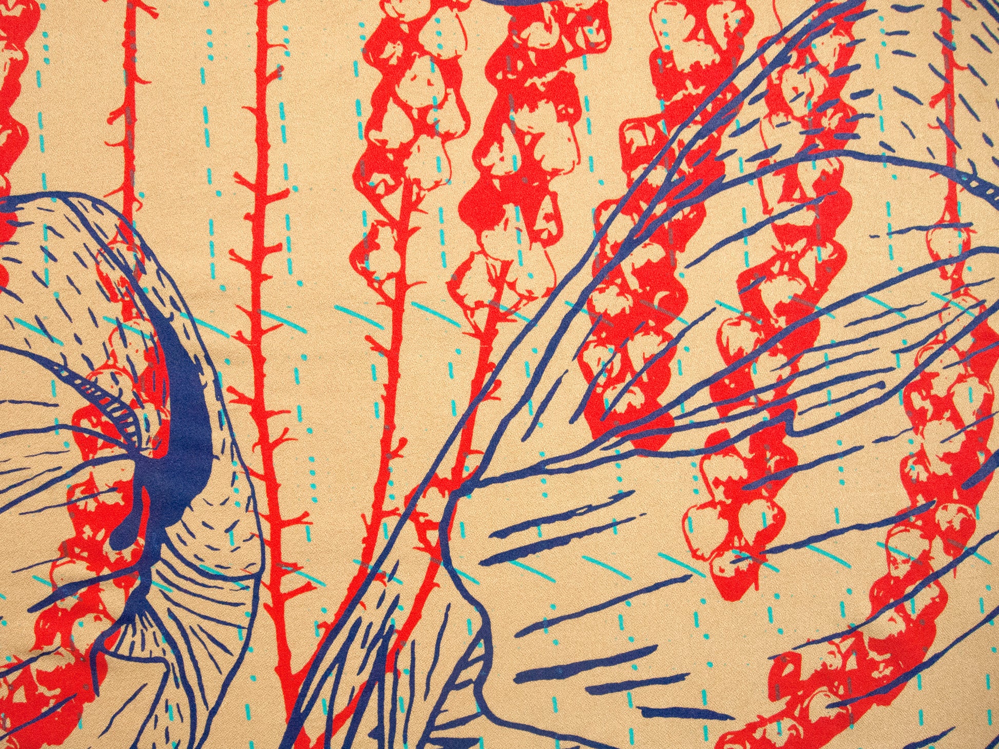 100% bamboo viscose rayon is a light weight fiber that mimics silk but is vegan friendly. Its is dyed with fiber reactive dyes mixed for the perfect fall color.. Hand printed with Teal morse code, scarlet red bell flowers, purple coconuts.