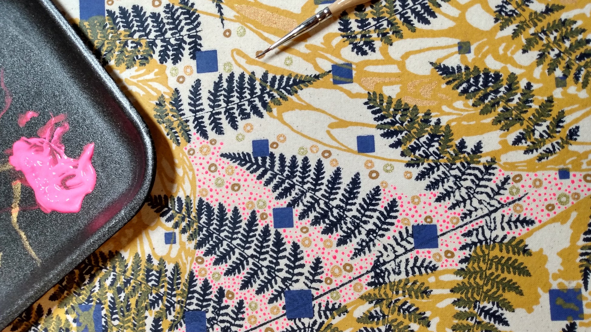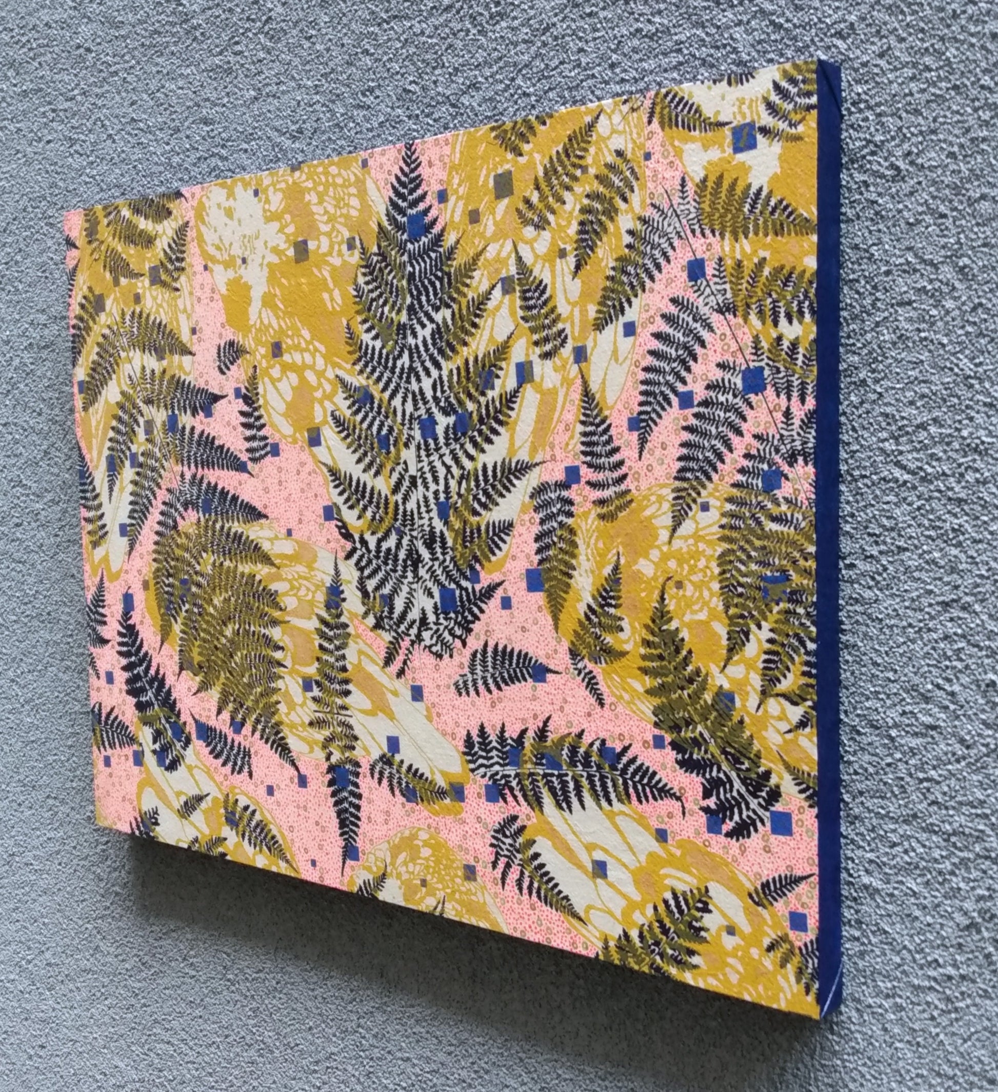 A piece of Better Than Jam fabric is adhered to a 18" x 24" birch panel frame. The fabric is first coated in a UV light protectant, then meticulously hand painted with acrylic paints in tiny detail adding extra pattern and color. A final gloss coating is applied to protect the details, and a wire cord is added to the back for hanging.