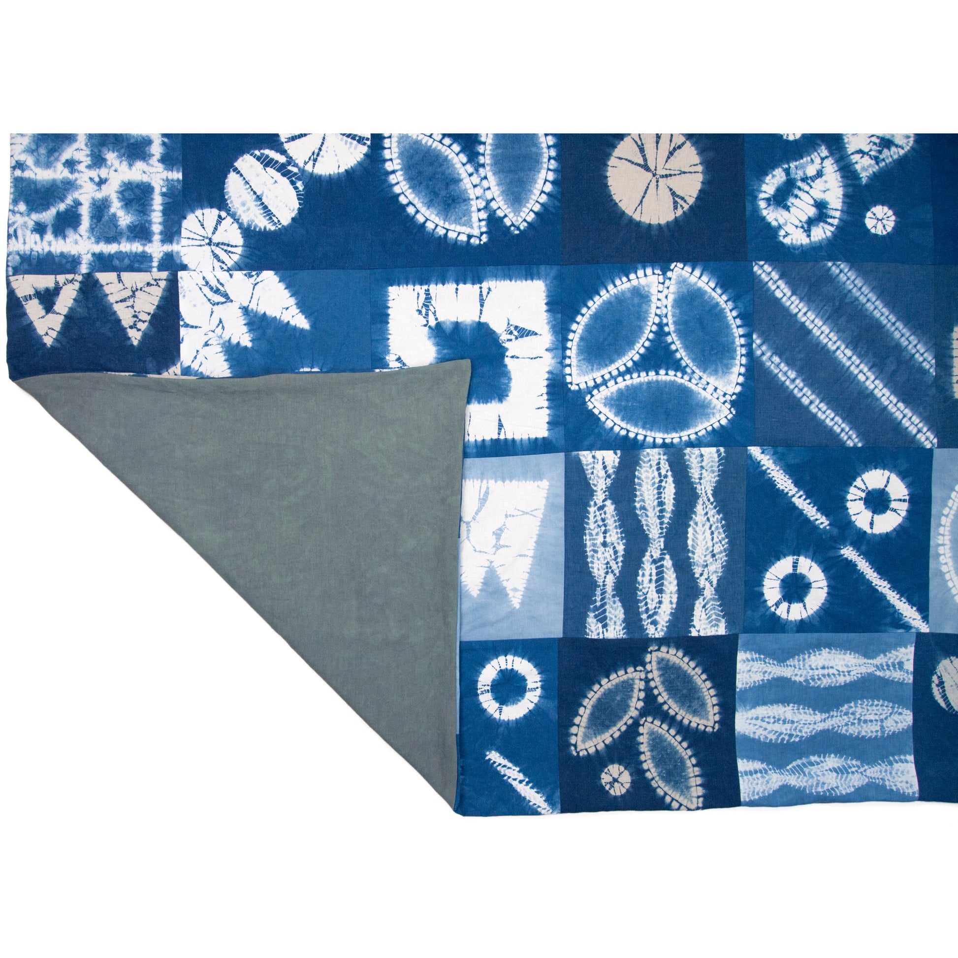 Patchwork Blanket of Indigo Dyed Squares as Throw or Queen Comforter