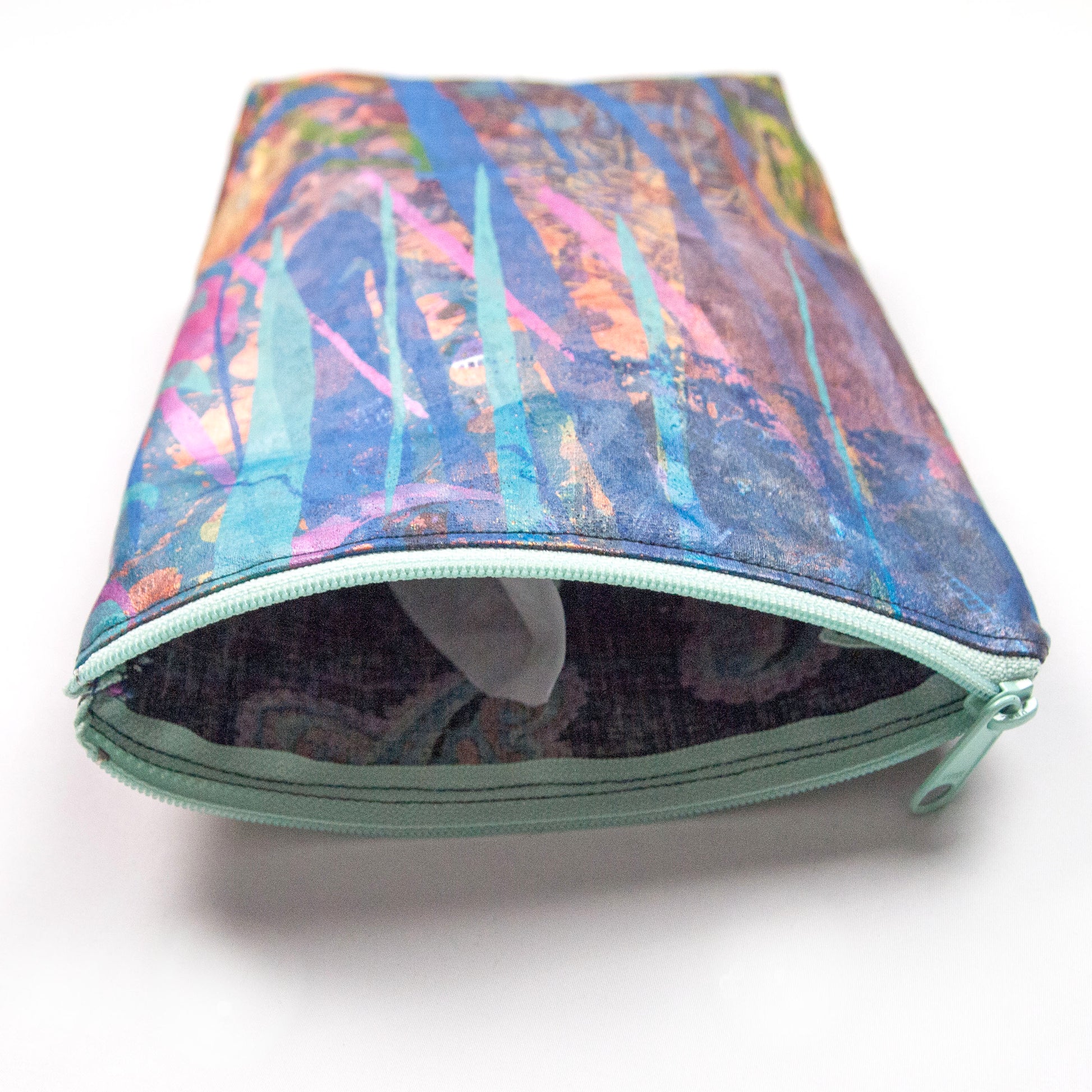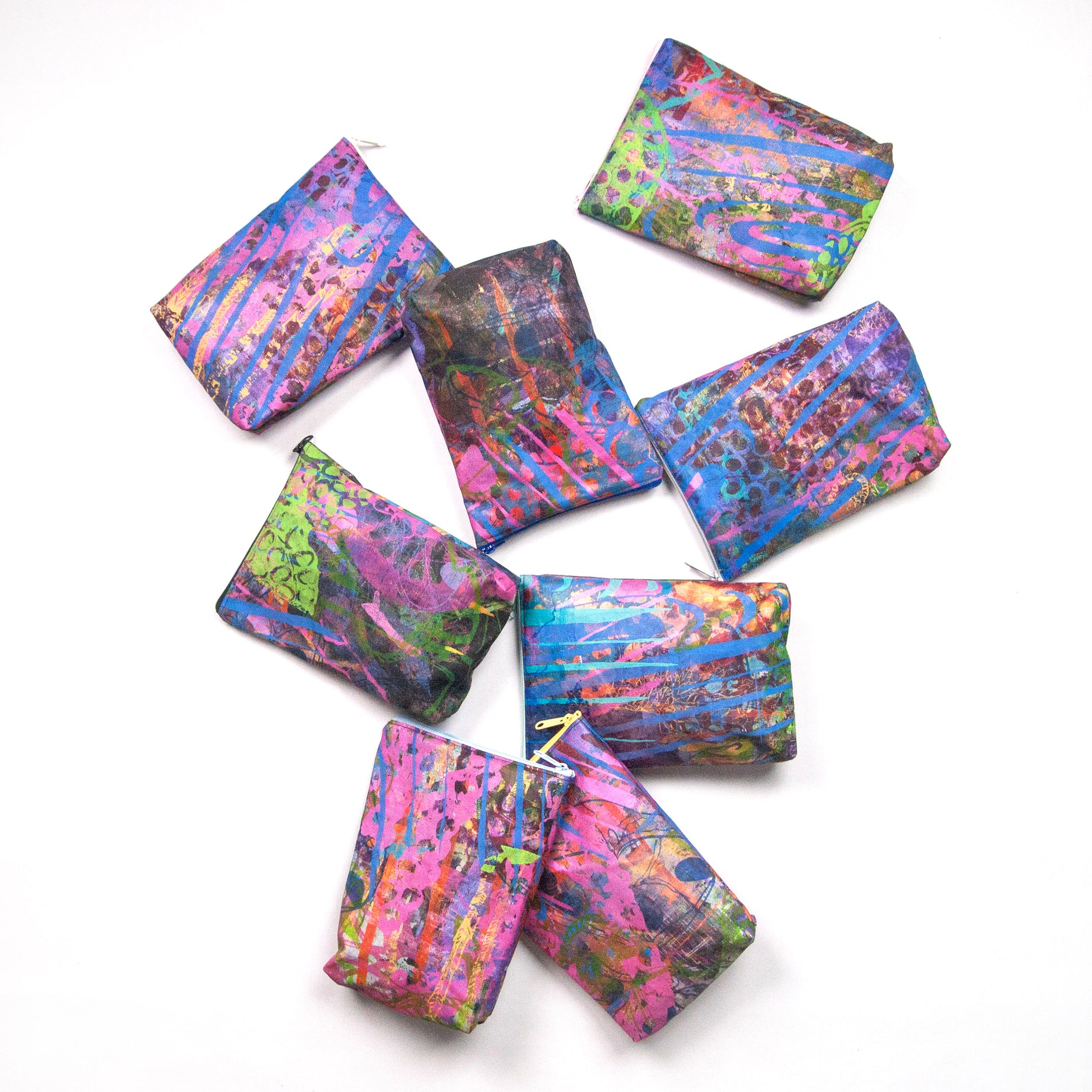 Sewn in house with different chunky colorful zippers. All are completely unique. 1.5" gusset bottom. Unlined, simple.