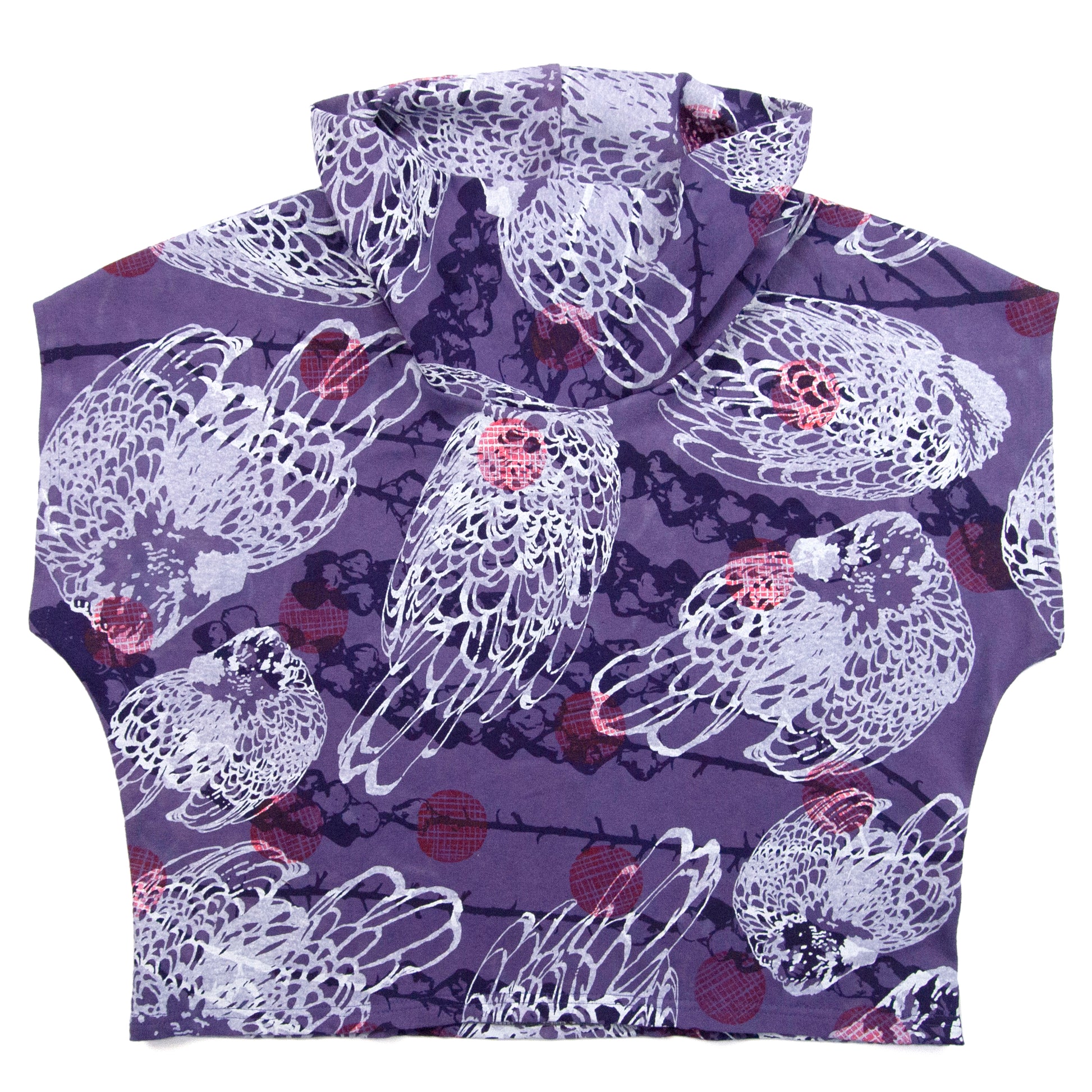 Purple dyed fabric Hand printed with: Purple bell flowers, White fancy chickens, and block printed red polka dots.
