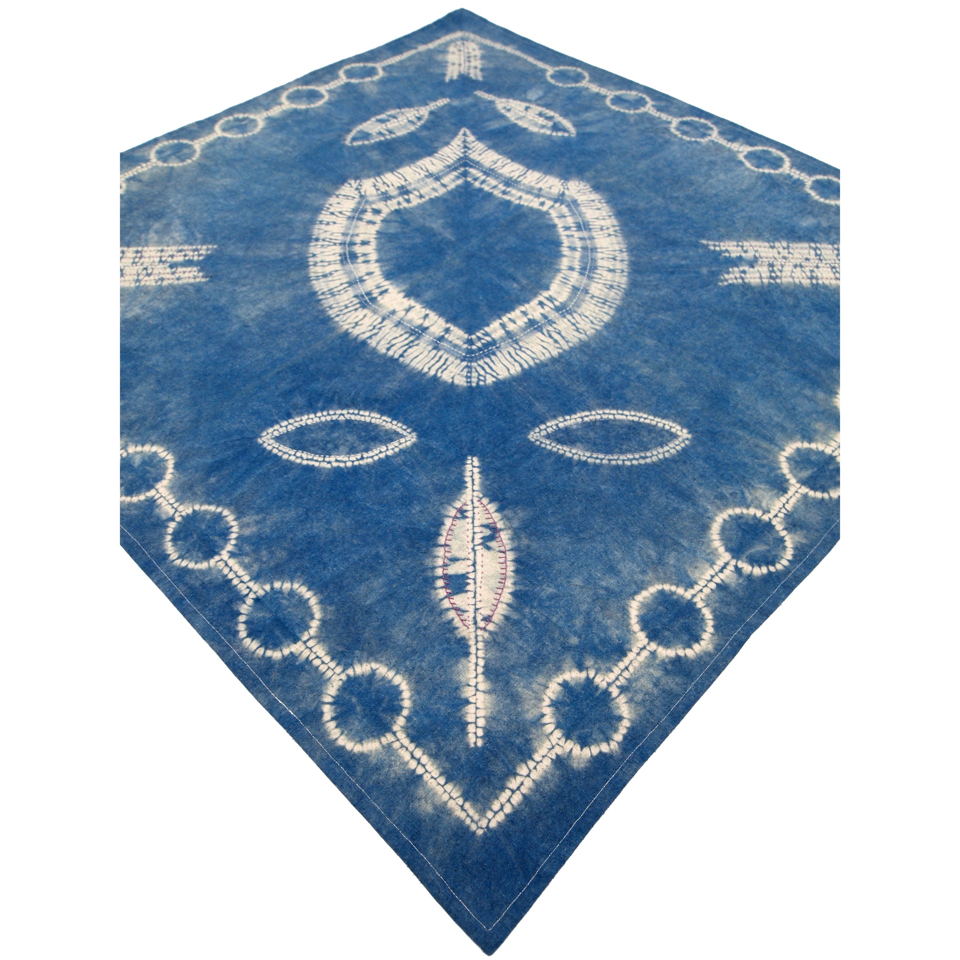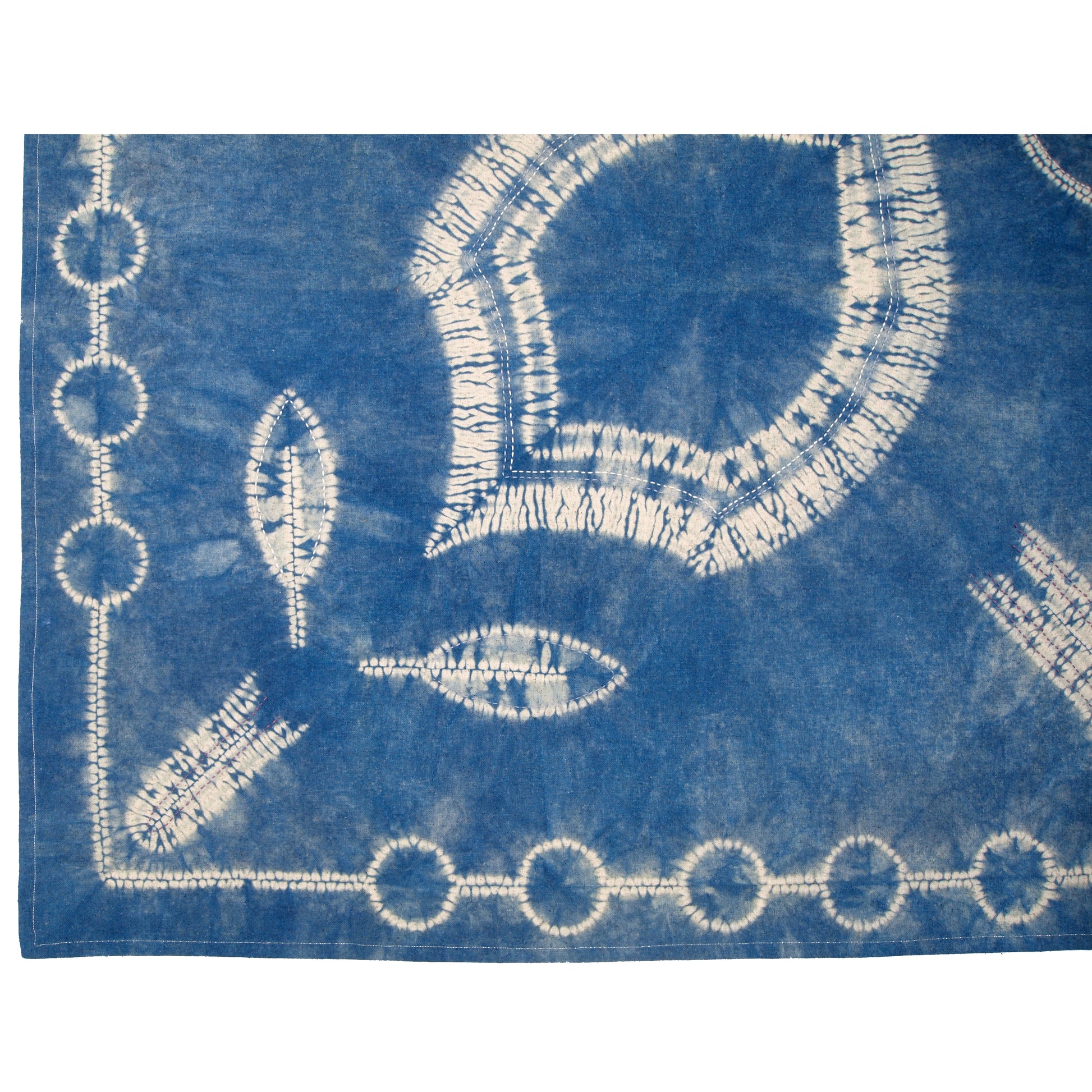 All works are created over a long period of time. At least a month but up to 6 months. The unbleached natural osnaburg cotton is first washed, as a dyed fiber must be to take the dye well. A pattern is freely hand drawn using chalk on the raw fabric. Then using extra strong sewing thread, the design is hand stitched using the running or overcast stitch. When pulled extremely tight, the thread and bunched fabric forms a resist, blocking the dye. In this case an organic indigo dye vat is used for this lovely blue. After several dips in the vat, the piece is carefully rinsed, and then the stitching is removed. A thorough washing is necessary to remove the untaken dye, and you are left with the pattern that was drawn as the negative space the threads left. But that's not all. Using embroidery thread, extra special details are hand stitched onto the textile. Zoom in for a closer look! I love picking just the right color for each extra detail added. Metallic gold is my absolute favorite, but balancing with a dusty purple makes it magic.