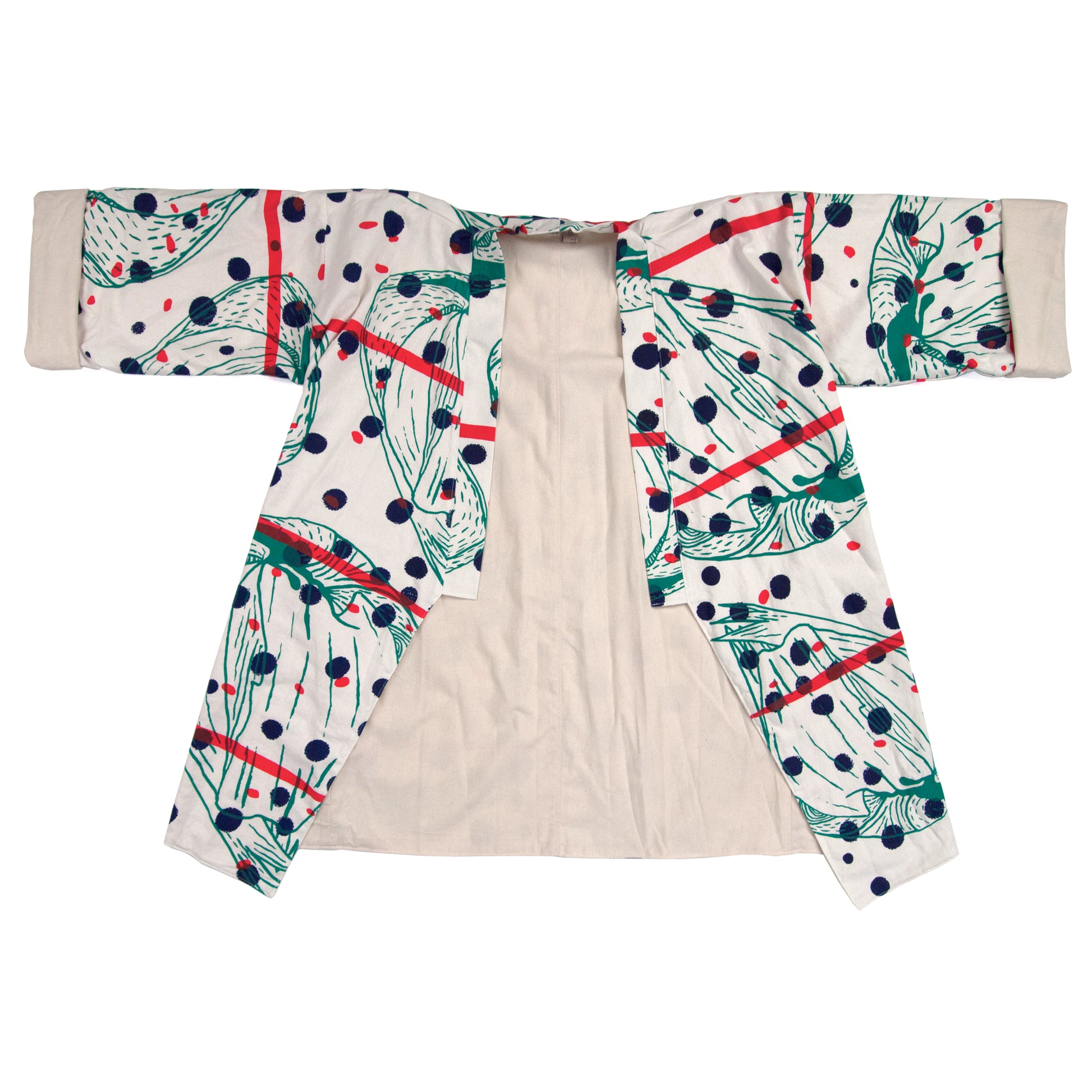 My new wrap! Inspired by a traditional kimono of Japan, my simplified pattern is sort of a mix of the female and male versions, so I hope that anyone will like to wear it. This "thing to wear" is meant to drape open, but ties if you want, with pockets hidden on each side. Make sure to wear left side wrapped over right, as the opposite the wearer would be deceased. What I've loved about some historical kimono I've seen is though a pattern may be simply created from straight lines, they are a moving exhibit for some of the most amazing fabrics; hand painted, printed and/or dyed the skill of hand is so great it's hard to fathom the artisans talent. I hope my textiles do the iconic shape justice.