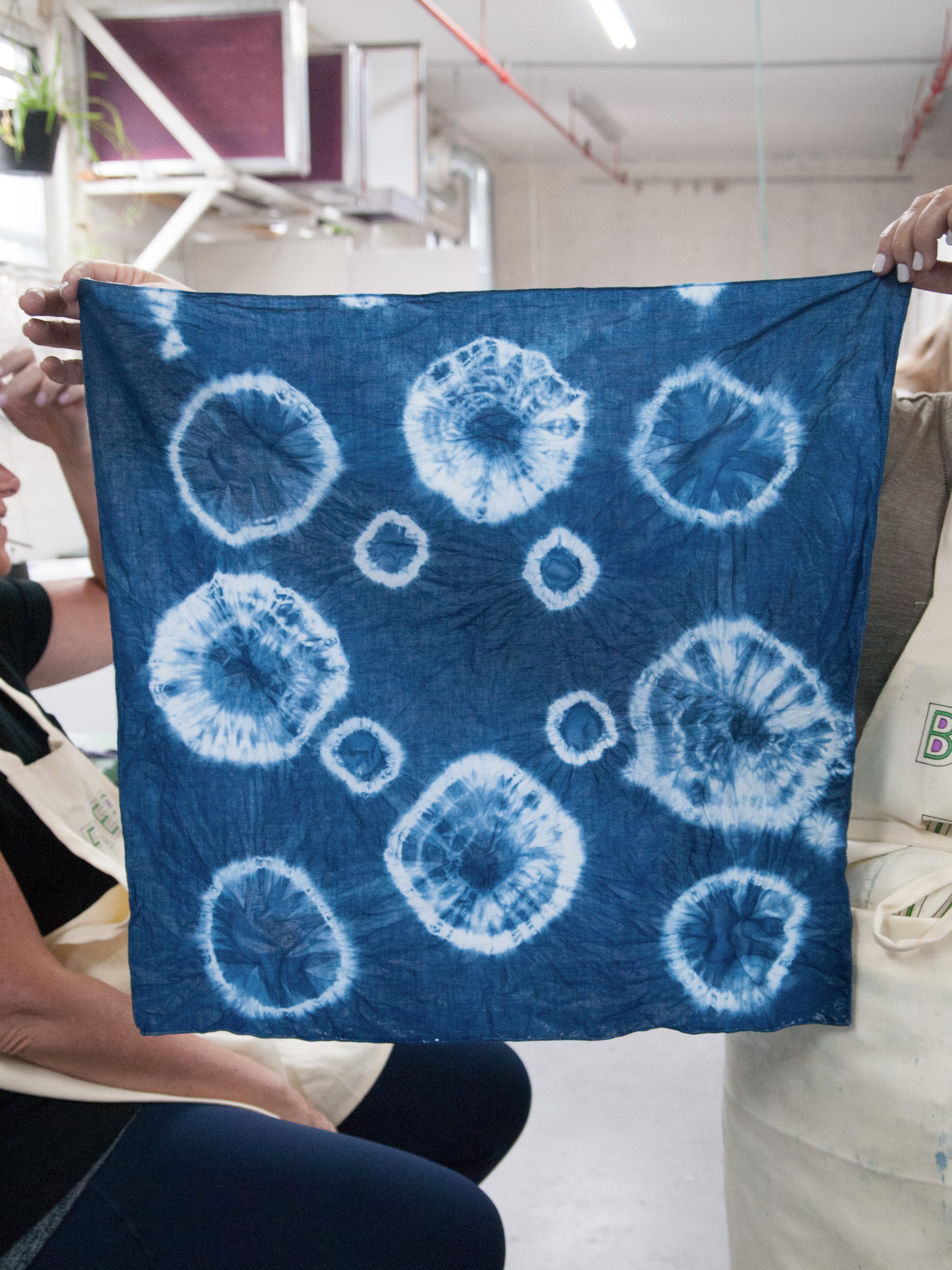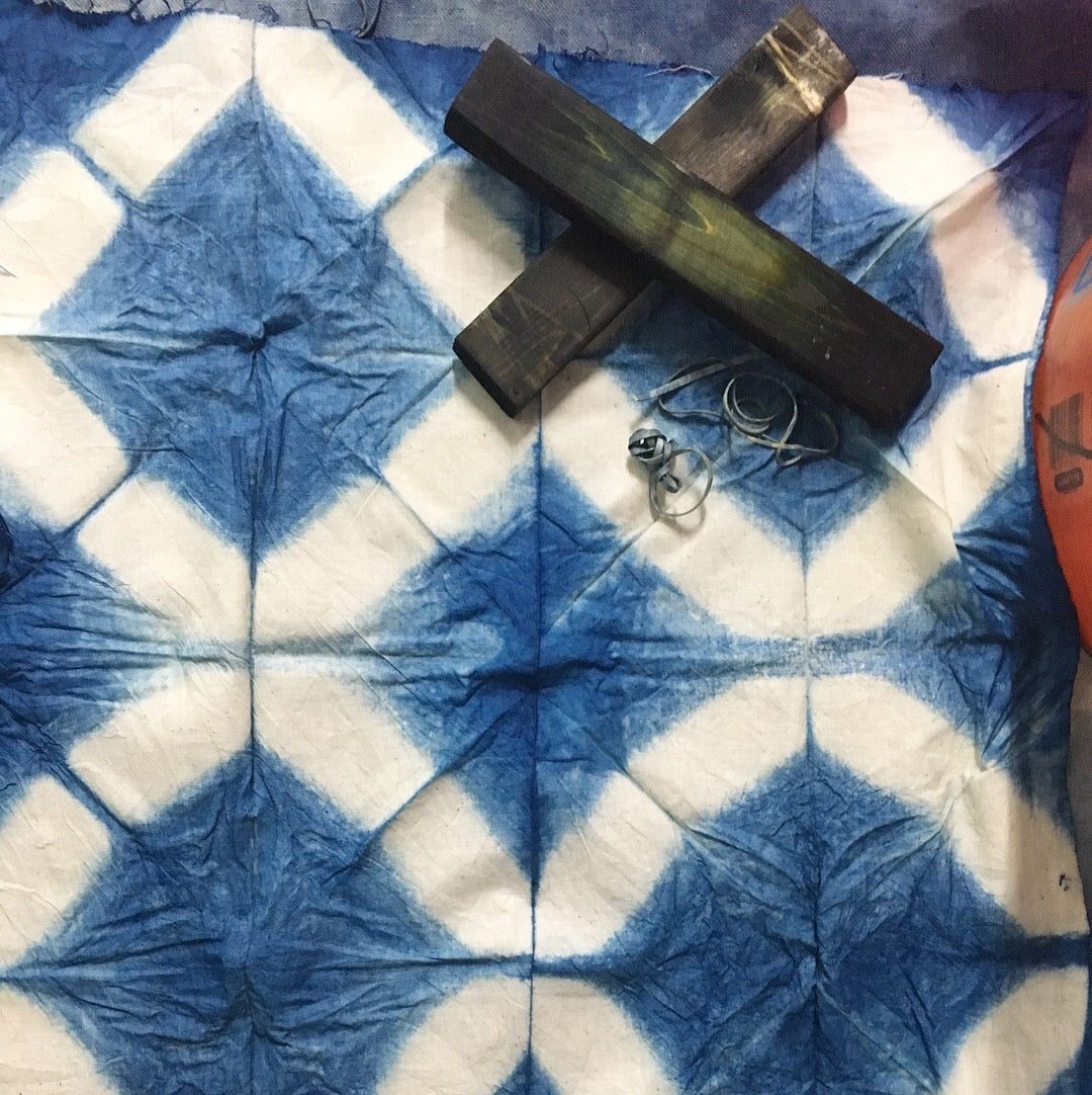 3-4 shibori dyed pieces they made during the event (materials are supplied or guests can bring their own pre-washed silk/cotton/linen small to medium sized item)