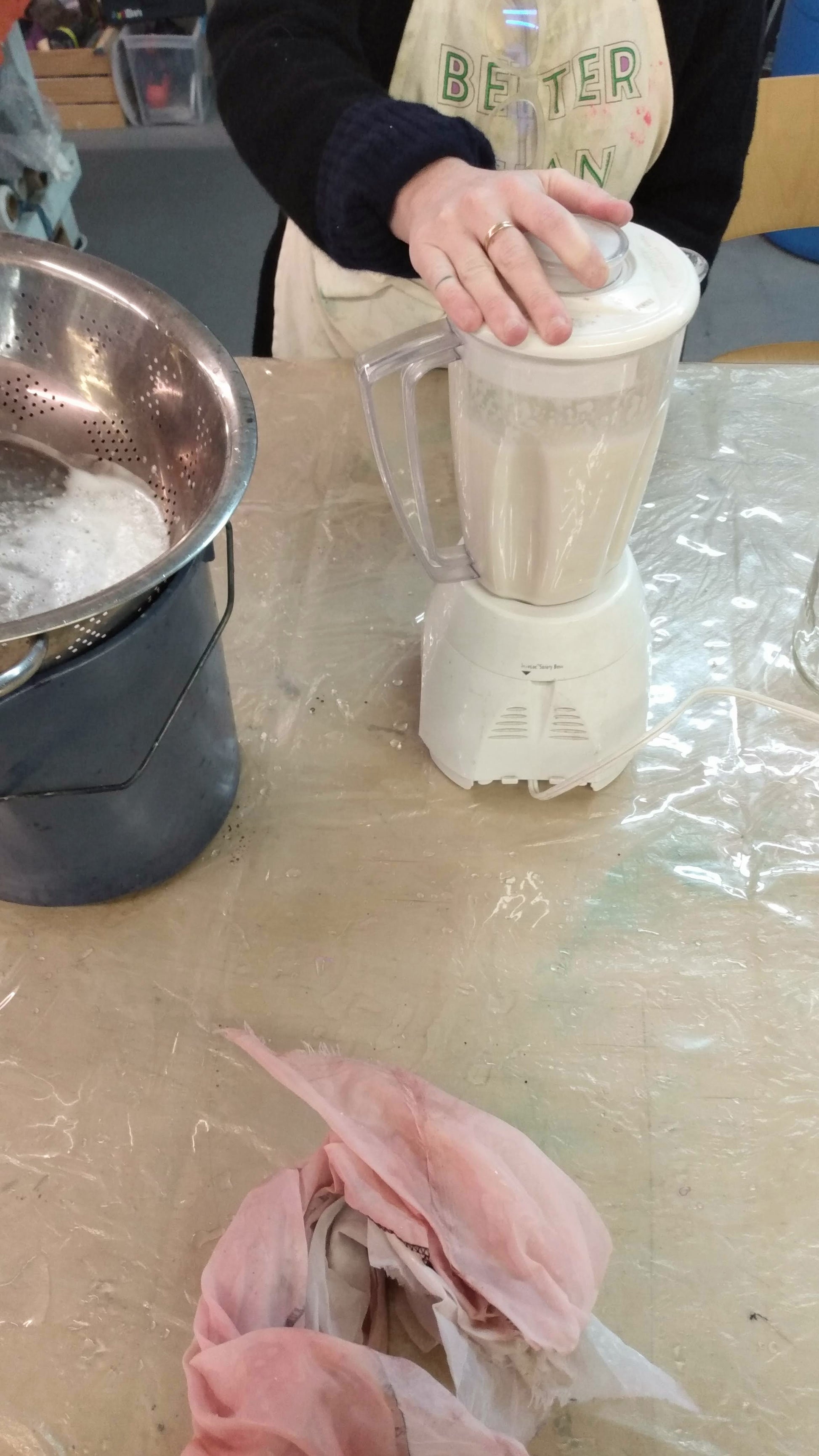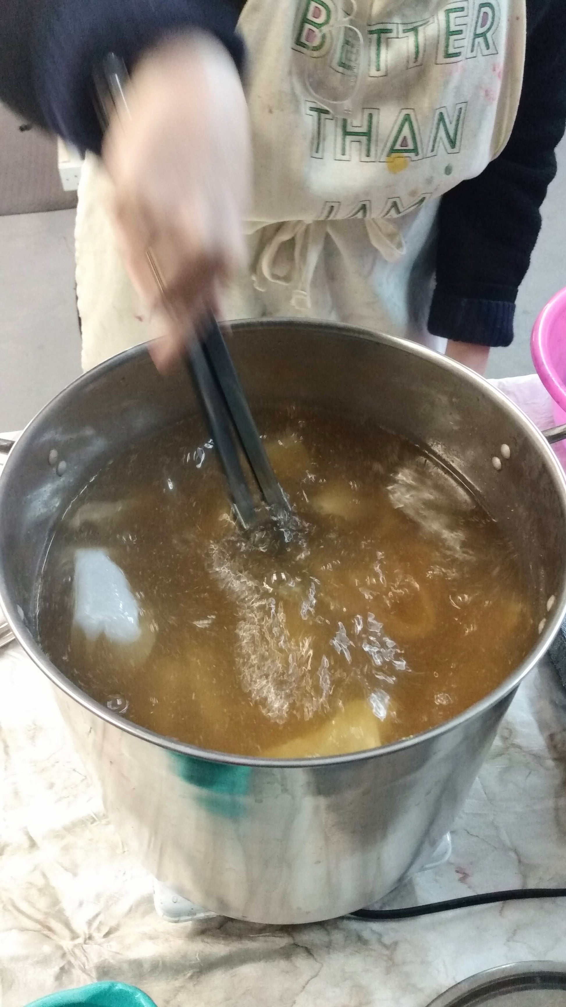 Day 1: Mordanting with alum, iron, alum acetate, and using soy binder. Preparing dye baths; madder cochineal and dipping in indigo for overdyeing. Preparing our dye baths.